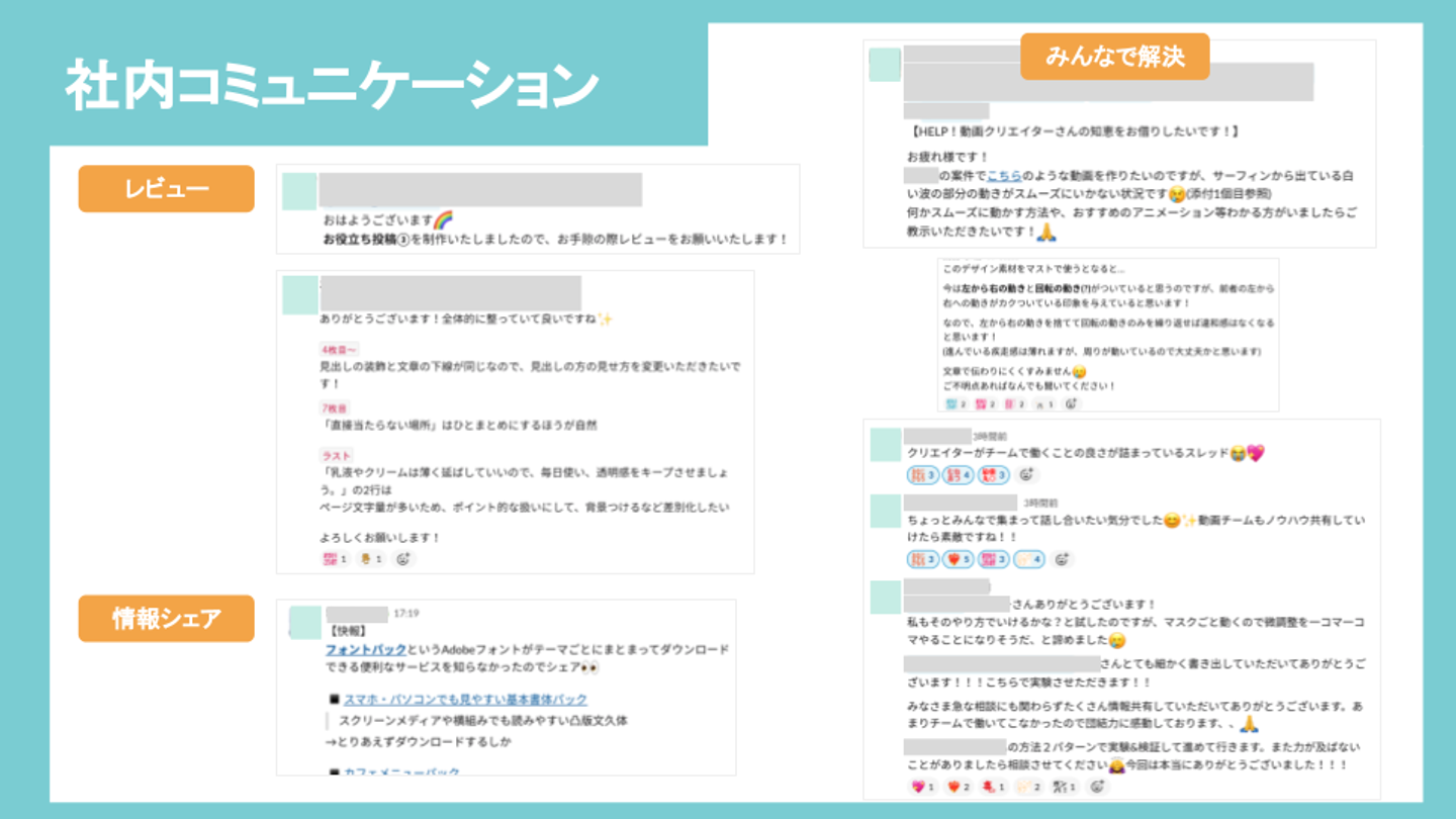 例えば昨日、ある参考動画のように動画を作りたかったのですが、やり方がわからず困ってしまいました。そこで動画クリエイター全員にSlackのチャンネルで、良い作り方がないか質問を投げかけたところ、一晩でたくさんの回答が集まり問題を解決できました。このようなやりとりは、ごく日常的に起こっています。