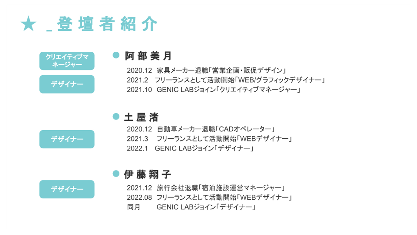 杉本:座談会形式で、事前にいただいた質問に答える形で進めます。まず、登壇者のみなさんがGENIC LABで働き始めた理由を教えてください。