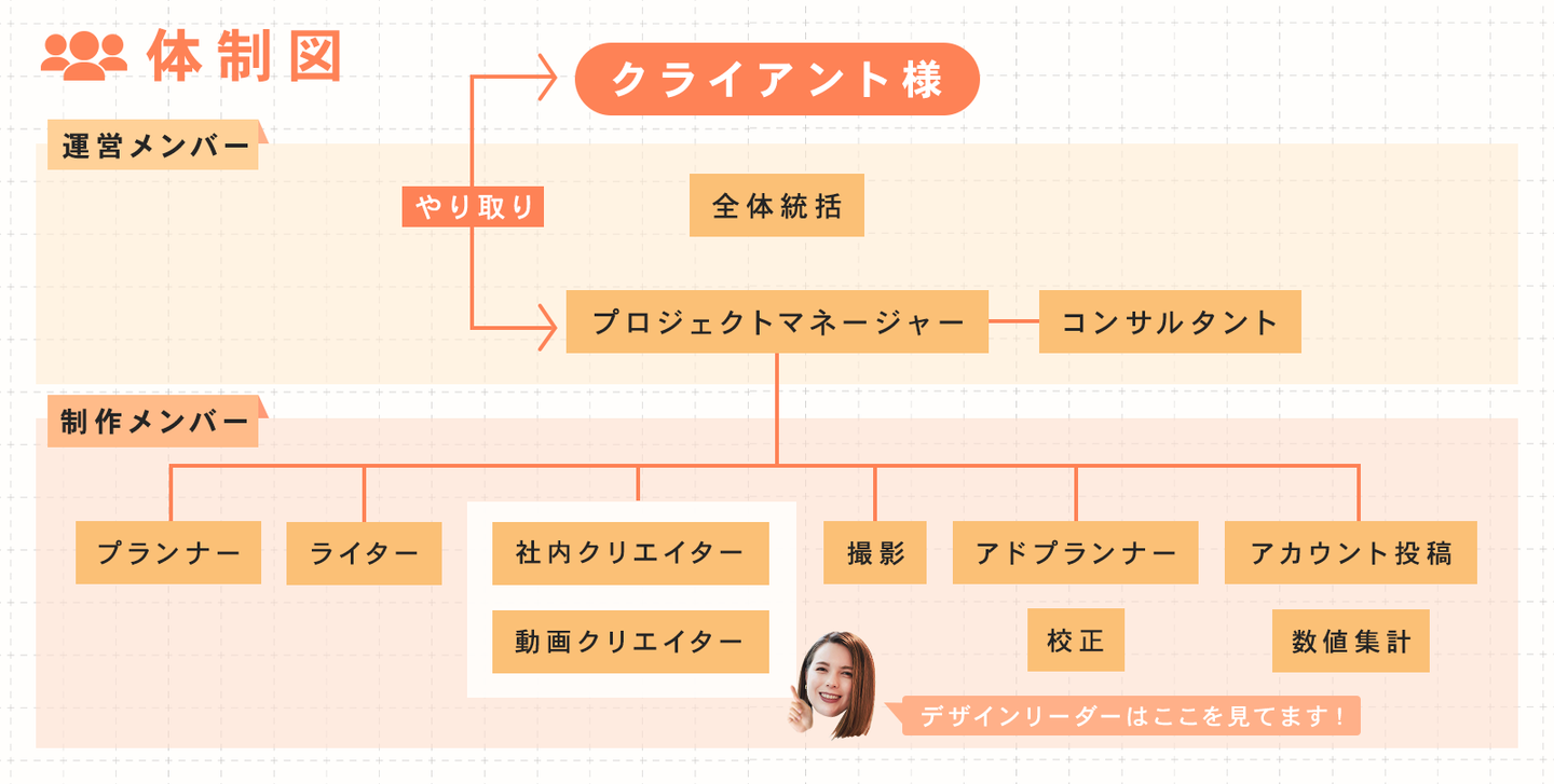 そして、CREAVEで請け負う企業のSNS運用案件ごとに、PM(プロジェクトマネージャー)と、複数の業務委託のメンバーをアサインし、日々運用を行っています。こんなにたくさんの業務委託のクリエイターが在籍し、一緒にプロジェクトを進める会社はなかなかないと思うので、とても特殊なチーム体制をとっていると思います。