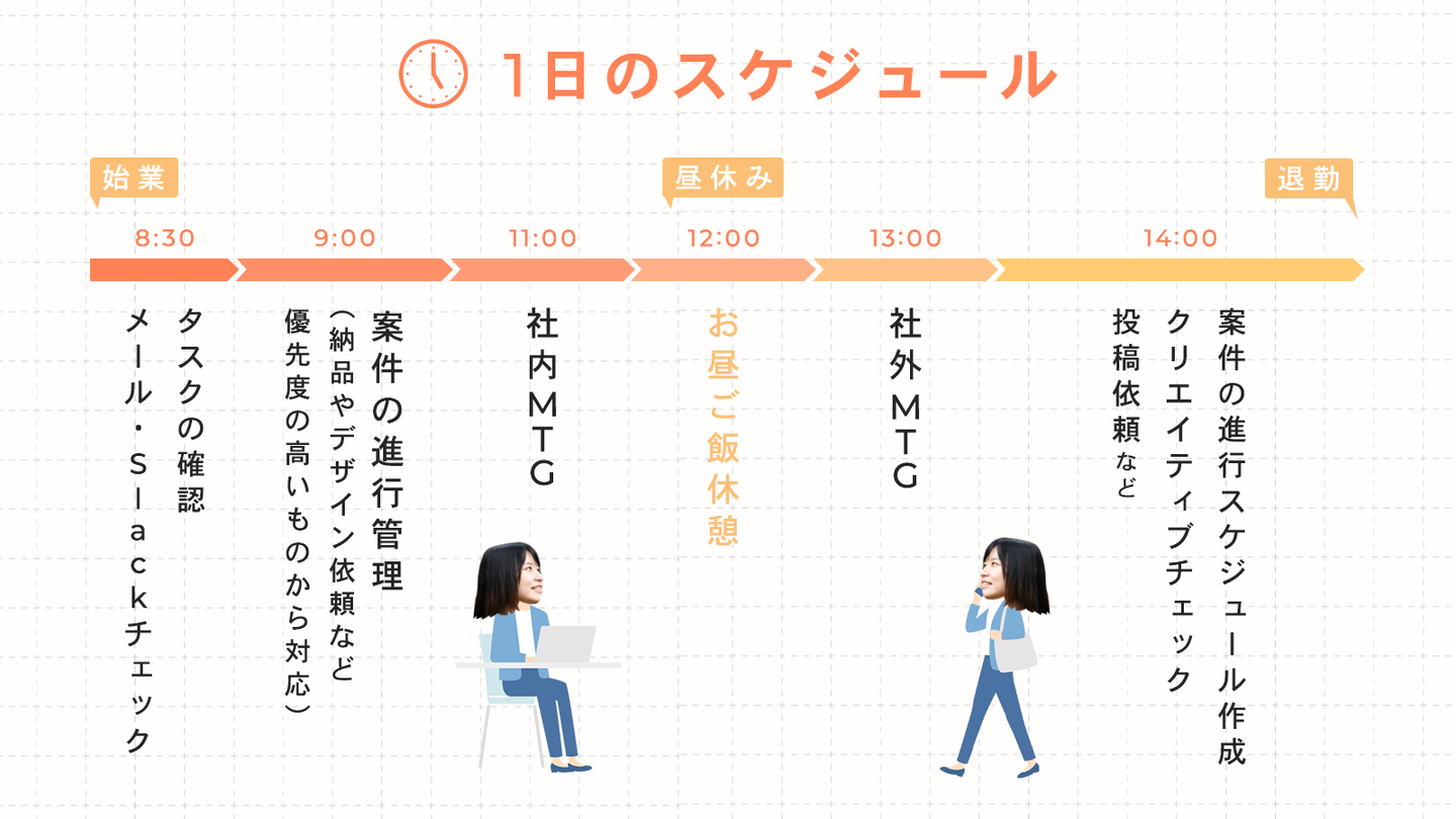 間に入り、スケジュール管理や、認識の齟齬が起こらないようにすり合わせを行ったり、全員が気持ちよく働けるように橋渡しをする役割です。
