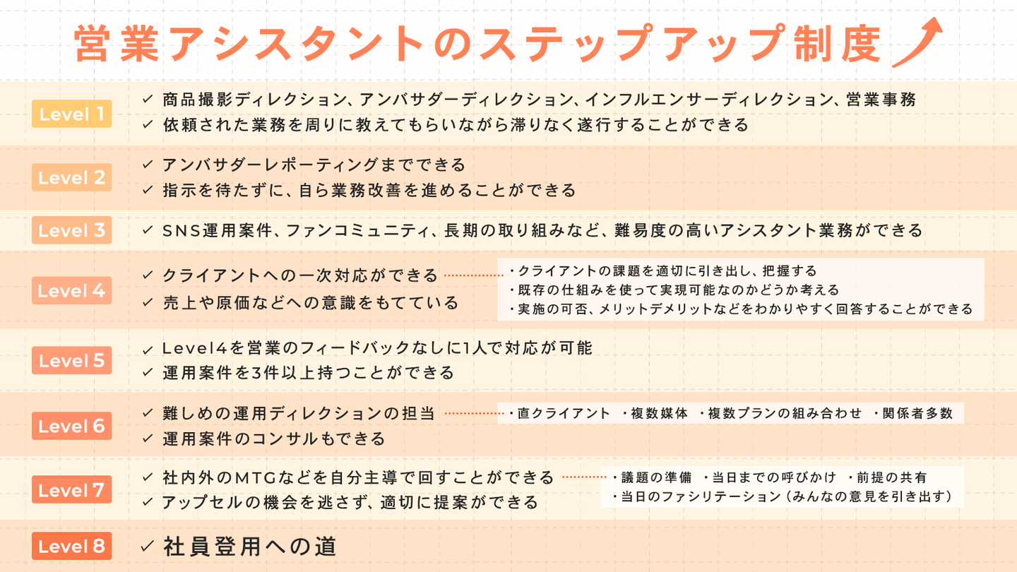 ステップアップ制度は、下記のように簡単なアシスタント業務から始まり、SNS運用案件のディレクション(プロジェクトマネージャーの役割)まで、希望すればステップアップしていく事ができ、時給が上がっていく仕組みです。これまでも営業アシスタントから、営業やプロジェクトマネージャーの社員にステップアップしていったメンバーが複数います。