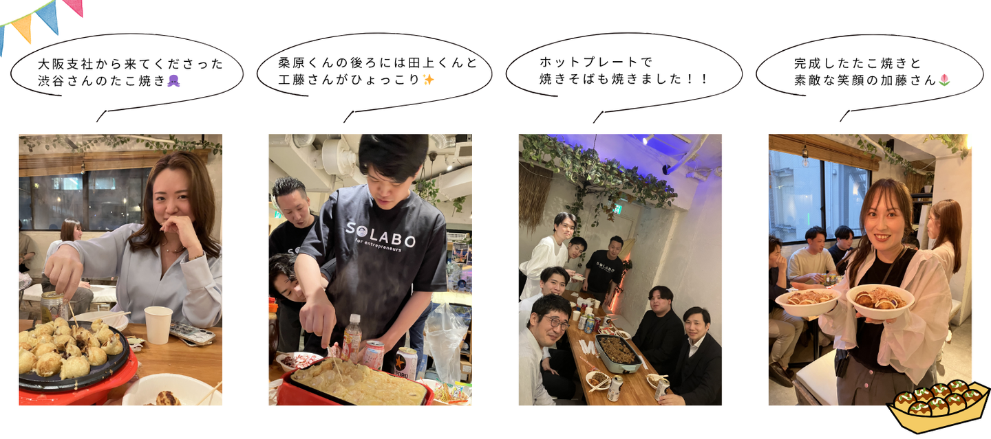 普段は別々のチームで働いている社員同士も、たこ焼きを囲んで自然と会話が弾み、部署を超えた交流が生まれていました。
