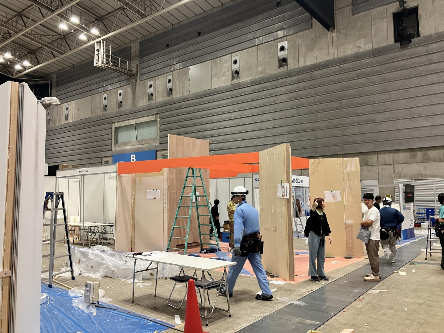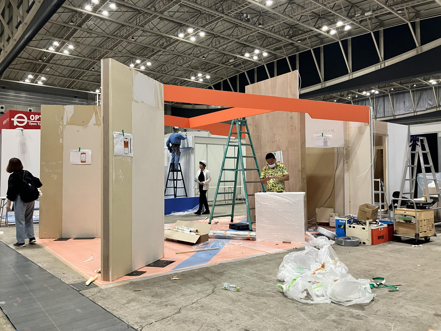 会場は、各種ブースの施工がはじまったばかりで、工事関係者の異様な熱気に、ついに本番がはじまる!という大きな期待が膨らむと同時に、事故なく運用しなくては!という冷静な使命感が不思議と湧いてくる、そんな体験でした。