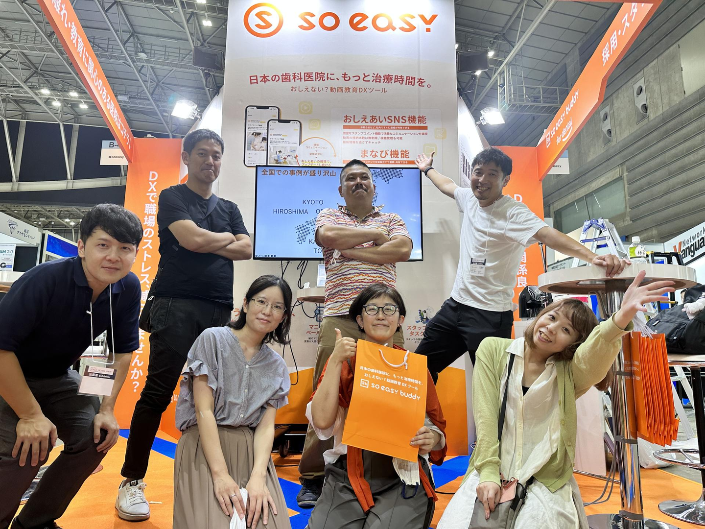 (色々な立場や組織を飛び越えて、soeasyブースに集まって記念撮影をするみなさんの素敵な笑顔)