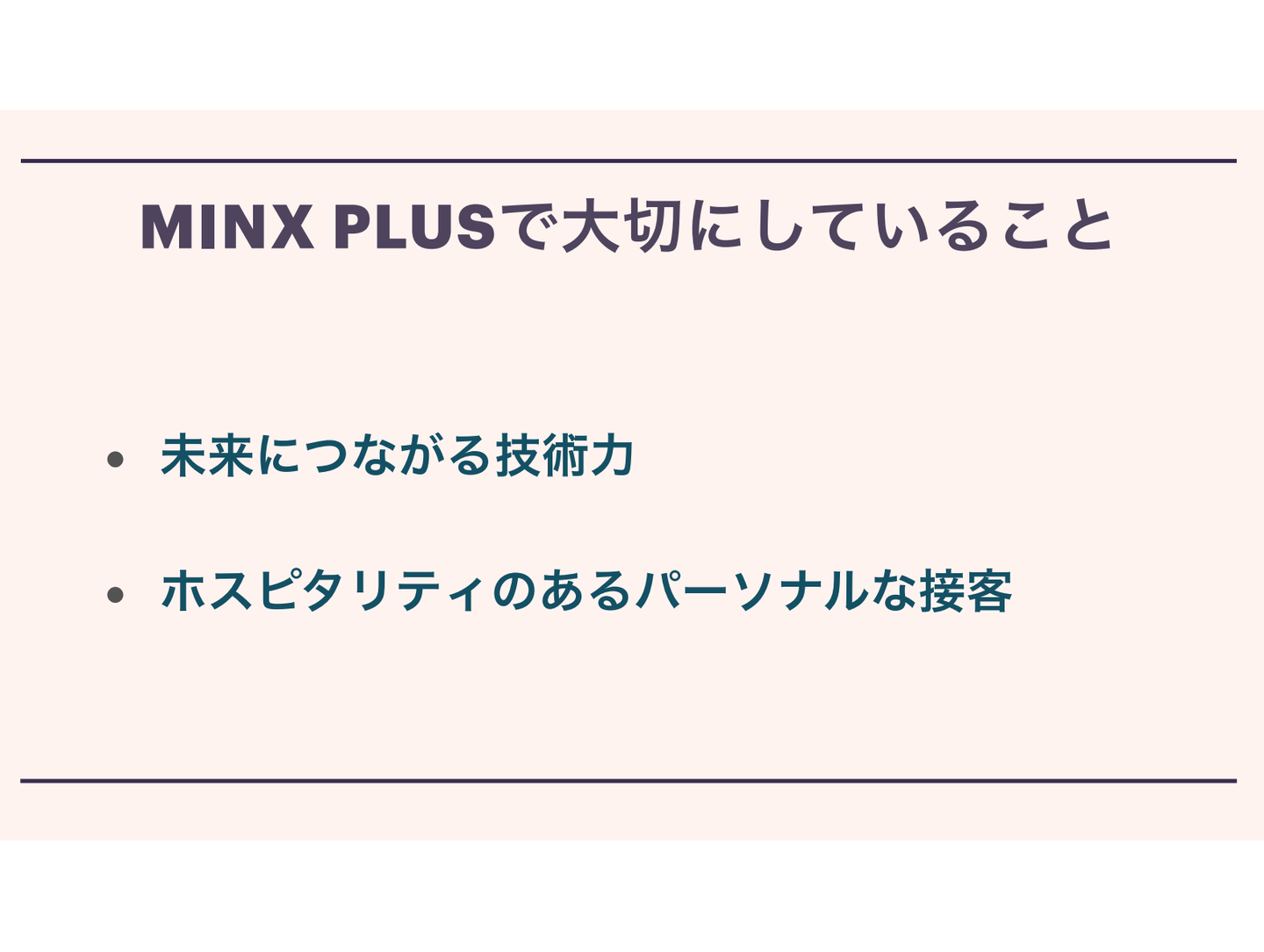 (技術力とホスピタリティを何より大切にされている、それがMINX plusらしさ!と弾ける笑顔でプレゼンいただきました)