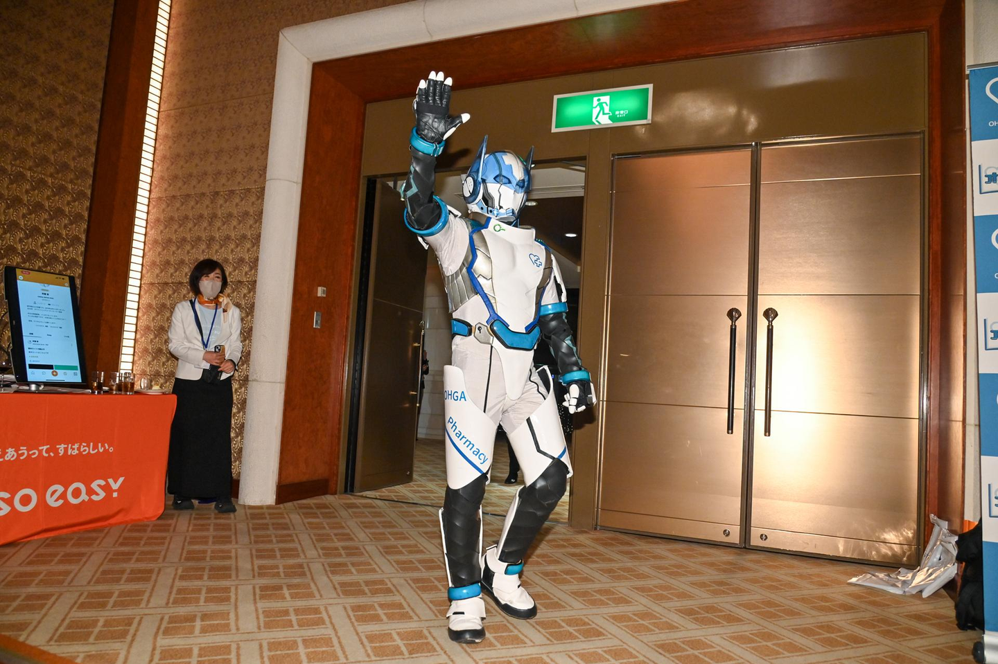 パートナー企業様も、このアフターパーティーを全力で盛り上げようと、ヒーロー戦隊の演出でサプライズ。株式会社大賀薬局様のヒーローであるオーガマンが突然会場に現れると、さらにボルテージが上がります。