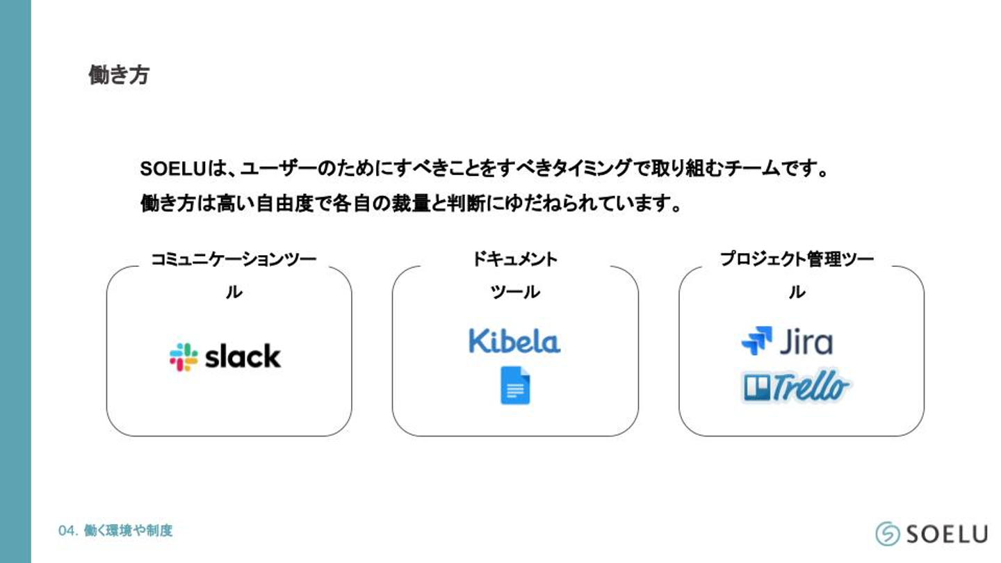 今回は、より具体的な使用ツールの紹介やコミュニケーション方法など、SOELUの働き方を紹介させていただきます!