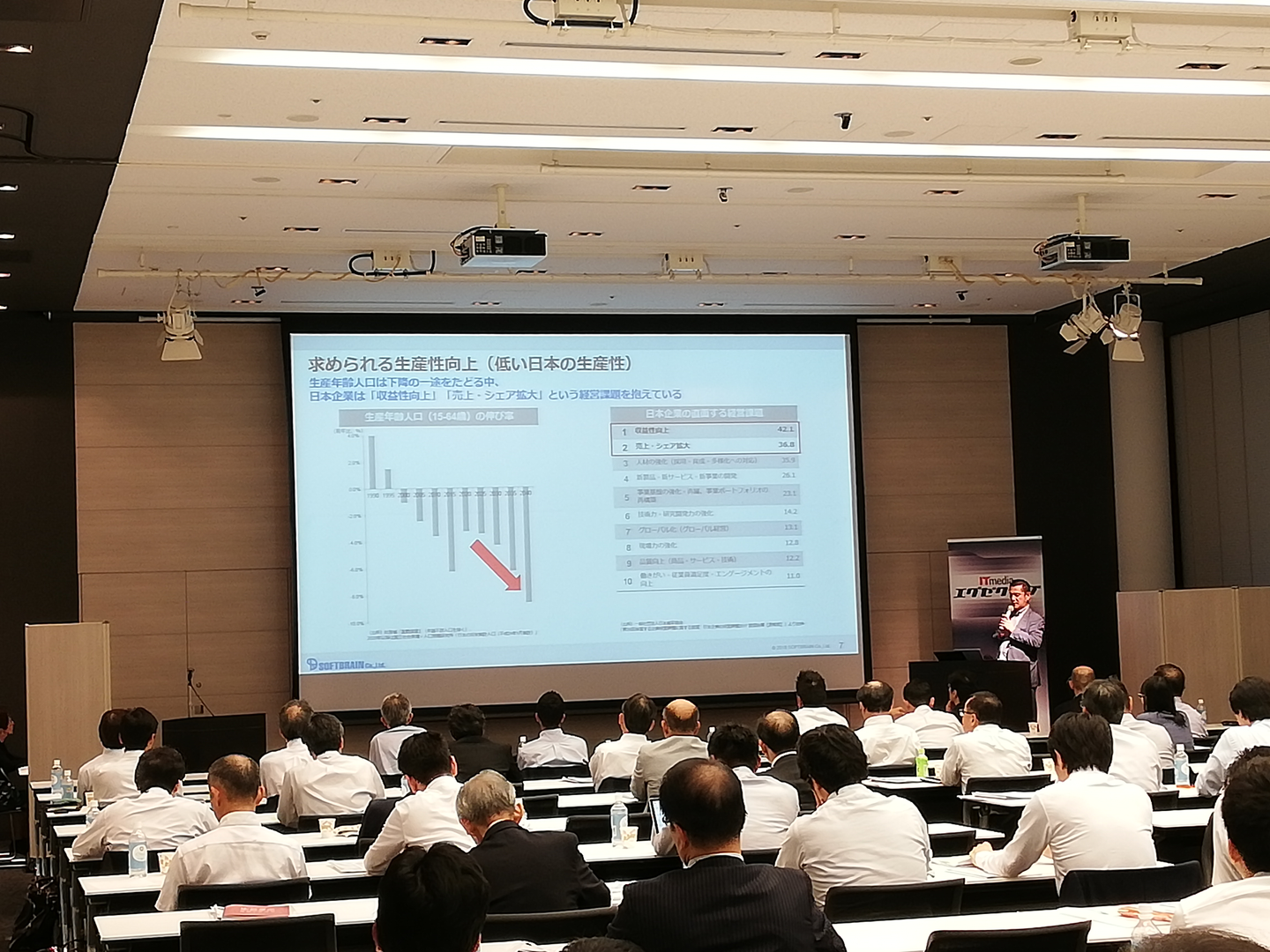 このセミナーで、長田は「顧客データを活用する科学的営業マネジメントのススメ」をテーマに講演。約100名のCEO(最高経営責任者)やCIO(最高情報責任者)に向け、「働き方改革」の議論では「休み方改革」「残業削減」の話になりがちだが、企業に求めらているのは「業務の効率化を進めながら売上・利益を伸ばす」生産性向上であることを訴求しました。