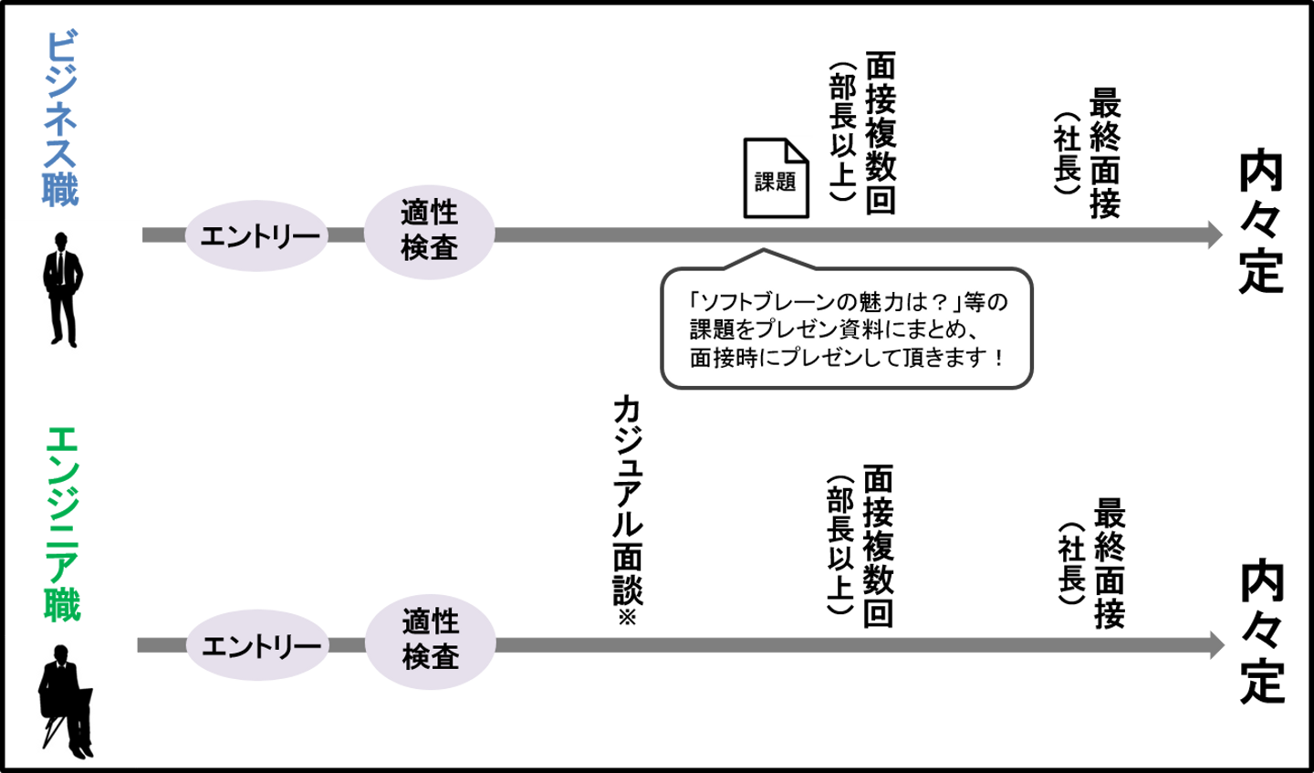※カジュアル面談:若手のエンジニア・人事との個別会社説明会。ソフトブレーンという会社について、皆さんがどんなエンジニアになりたいかなどをフランクに話します。これは面接ではありません!