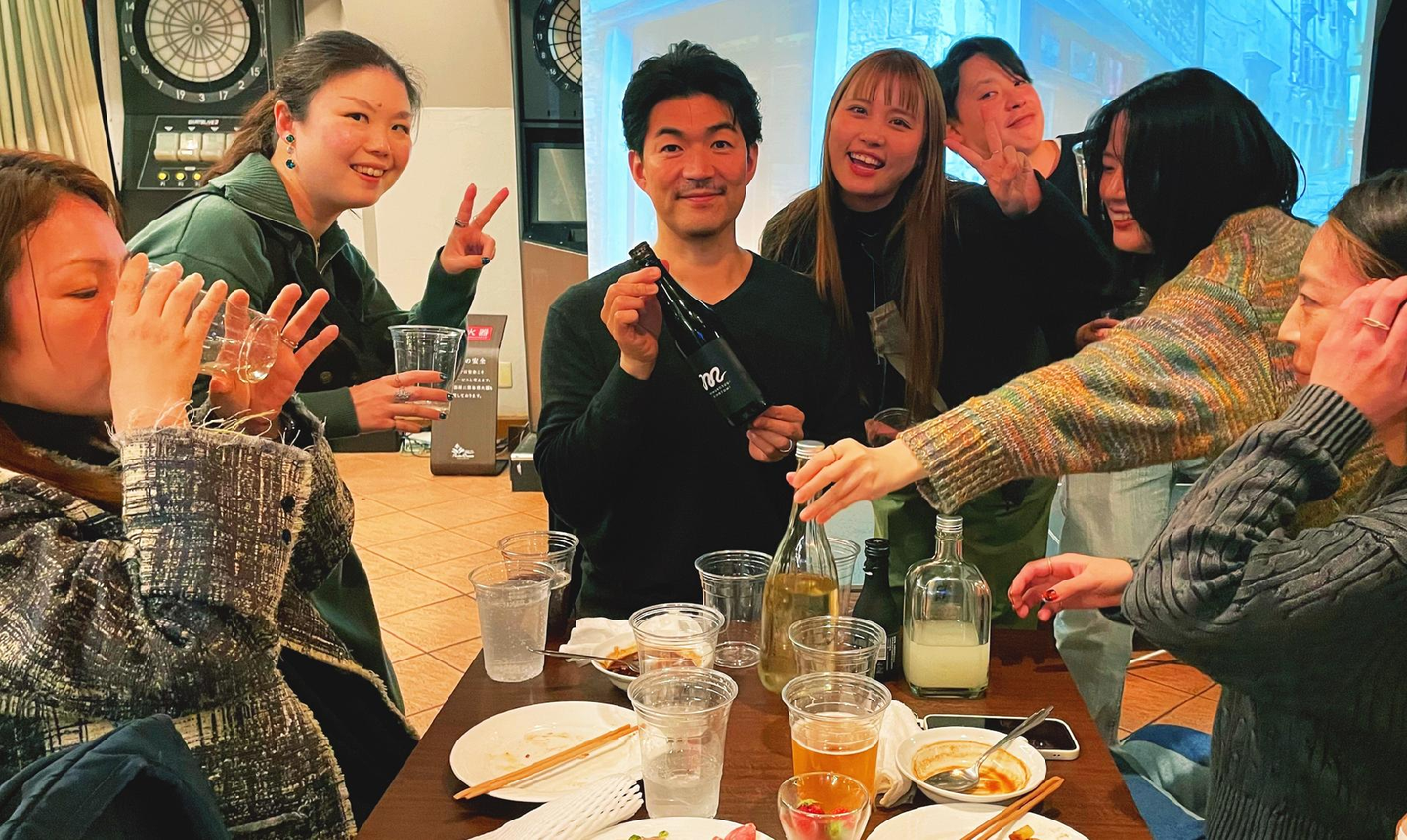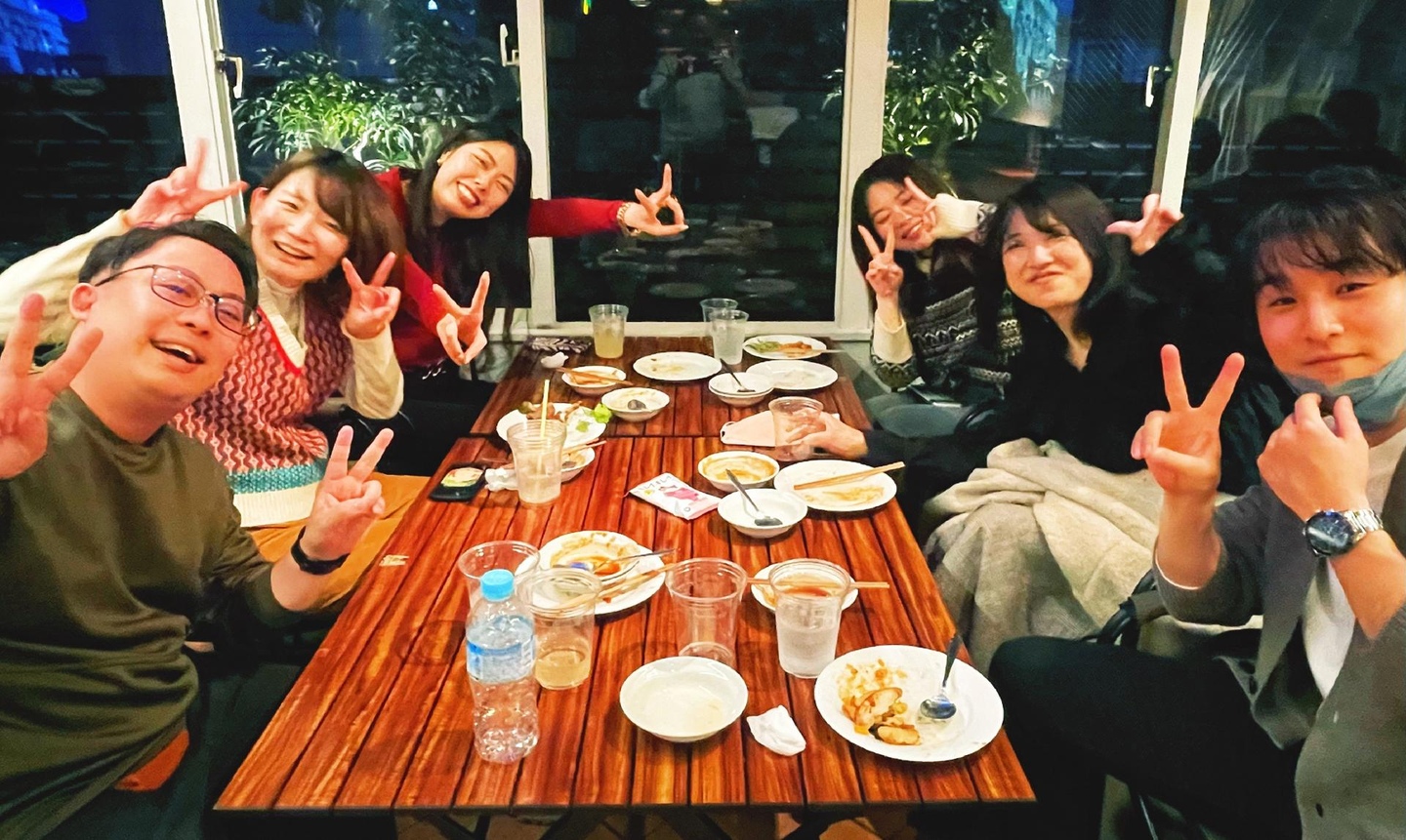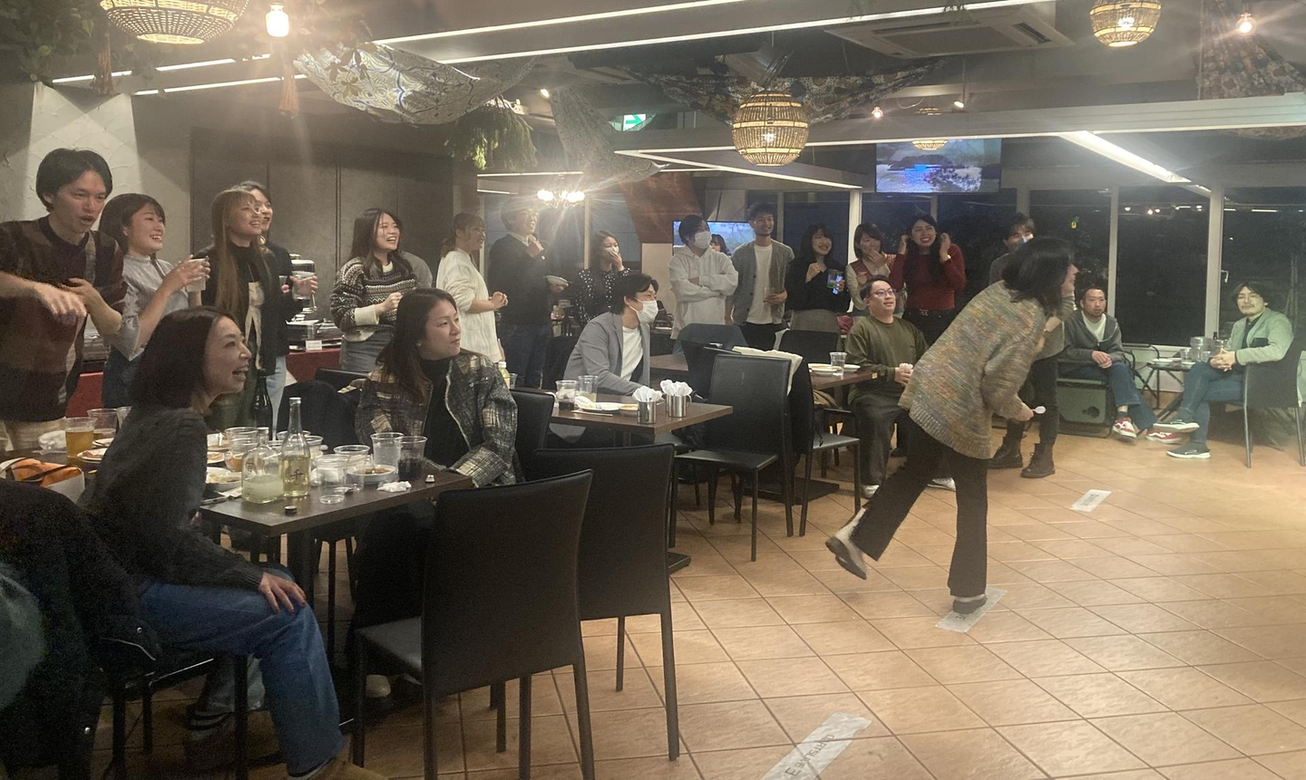 総会が終わると待っているのは納会=飲み会!=楽しみの時間のみ!乾杯したらもう食べもの争奪戦!笑 充分な量があるはずなのに、「食べる瞬間の幸せ」を我先に感じるために、みんな勢いよく食事を取りに行きます。これぞソーラーパートナーズらしいなと毎回笑えます笑 食べ物がどんどんなくなるので、どんどん補充されてどんどん食べて飲んでの繰り返しで、勢いに負けないように私も頑張りました!
