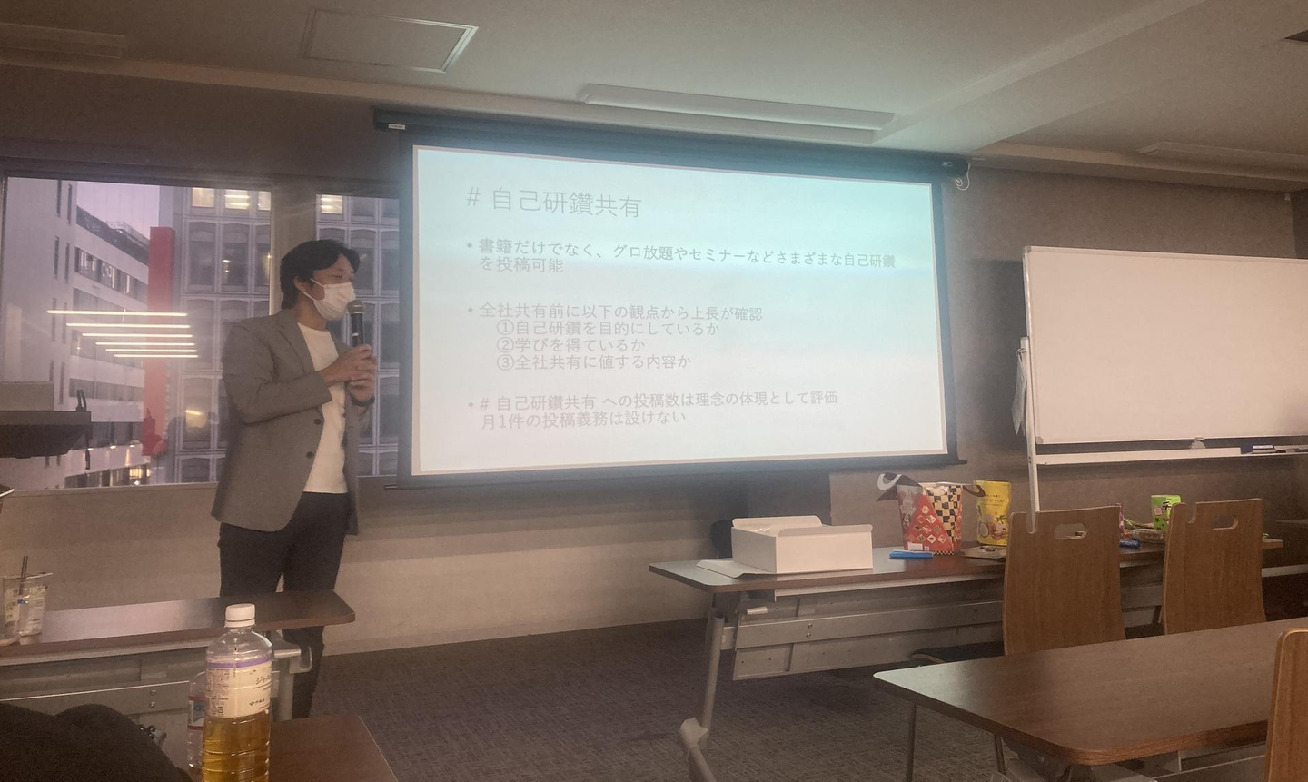 その後は理念研修。理念を意識したエピソードをみんなにシェアする時間です。今年を振り返り、それぞれの目線から感じた内容を共有しました。そこから来期の課題が見つかったりアイディアが浮かんだりと、個々でもチームでも、そして会社全体として理念を振り返る大切な時間となります。私は理念の中でも、ビジョンである「売り手よし、買い手よし、世間よし、未来よし」が特に好きなんですが、来期も「未来良し」につながるアクションが出来たらいいなと改めて振り返る事が出来ました。