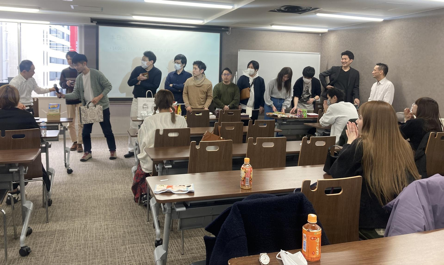 披露、紹介が終わったら昨年同様の流れで食べながら新3人組のチーム名を決めたりおしゃべりの時間。私はお菓子争奪戦に必死で参加しました笑。戦利品をみんなで食べながらあれこれ話す時間がすごく楽しかった!各チーム思考を凝らしてグルメを持ち寄っているので、おしゃれな洋菓子、おせんべいや信玄餅のような和菓子、そして地方名産の飲み物やおつまみなんかもありました。変わり種は駄菓子!!これは懐かしかったです。「小さい時これ食べたよね~」なんて言いながら過ごす時間は日常の慌ただしさとはまた違い和やかな楽しい時間でした。