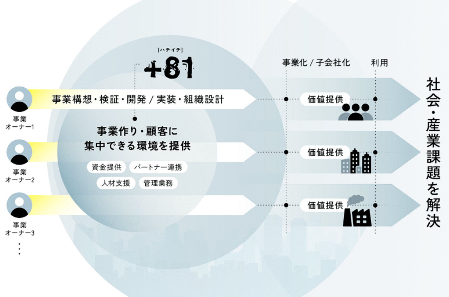 +81(ハチイチ)は、複雑な社会・産業課題に挑むアントレプレナーと共に、領域を問わず新規事業を同時多発的に創出していきます。特徴としては、創出した事業は成果に応じて子会社化しますが、子会社のEXITを前提とはしない点でしょう。