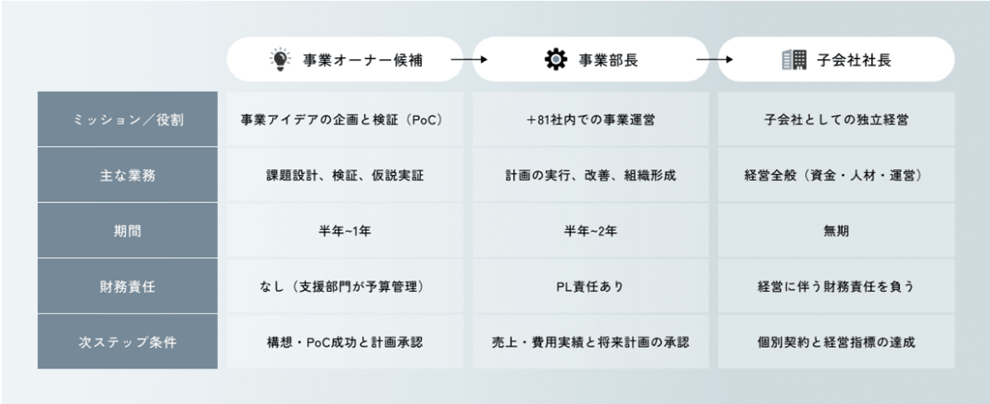 「事業オーナー」と呼ぶ事業家、アントレプレナーを外部より雇用し、構想から検証、開発・実装、組織設計までを一貫して支援します。