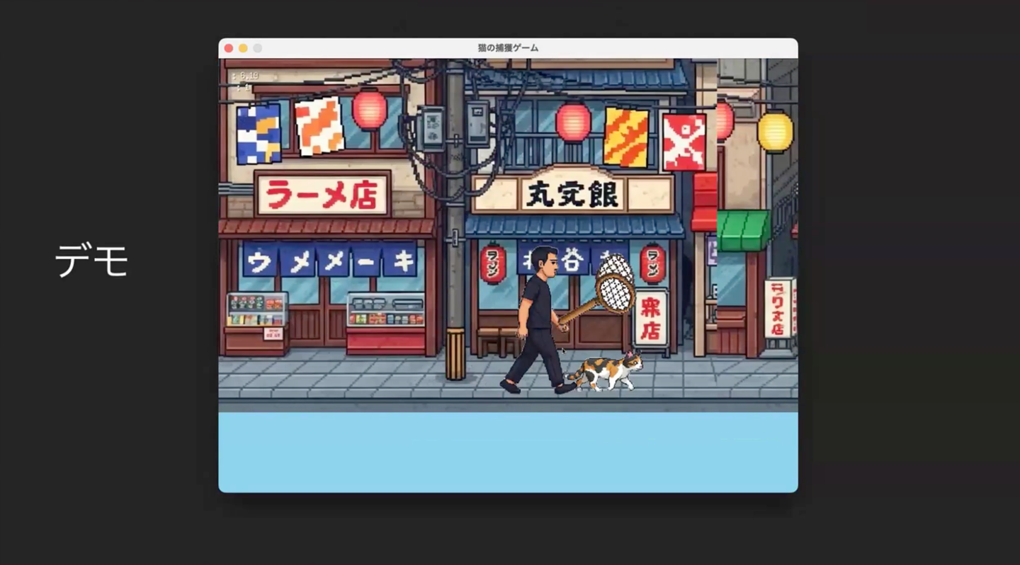 商店街のアイドル猫「ミーコ」を追いかけるスリル満点なゲームを開発。Claude Codeを活用し、キャラクター画像、背景、BGMまですべてAIが生成。街並みも瀬戸を参考に、AIでリッチなデザインを実現した点が素敵でした。