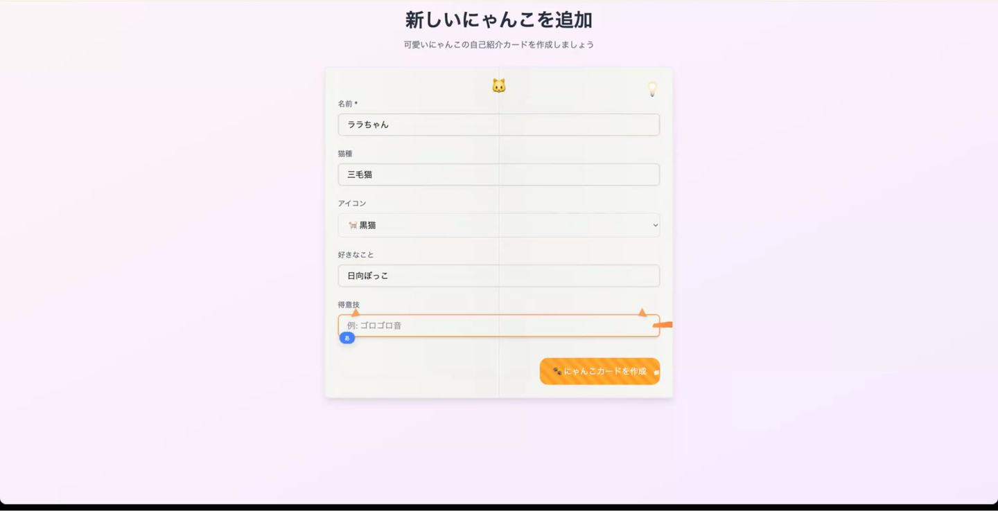 オフィスの猫を記録する「にゃんこ自己紹介カード」アプリと、猫の耳や尻尾が出る可愛いUIコンポーネントを提供するTailwind CSSプラグイン「ニャンキャットUI」を開発。npmパッケージとして公開されており、普段の開発にも彩りを与えてくれる完成度の高い発表でした。