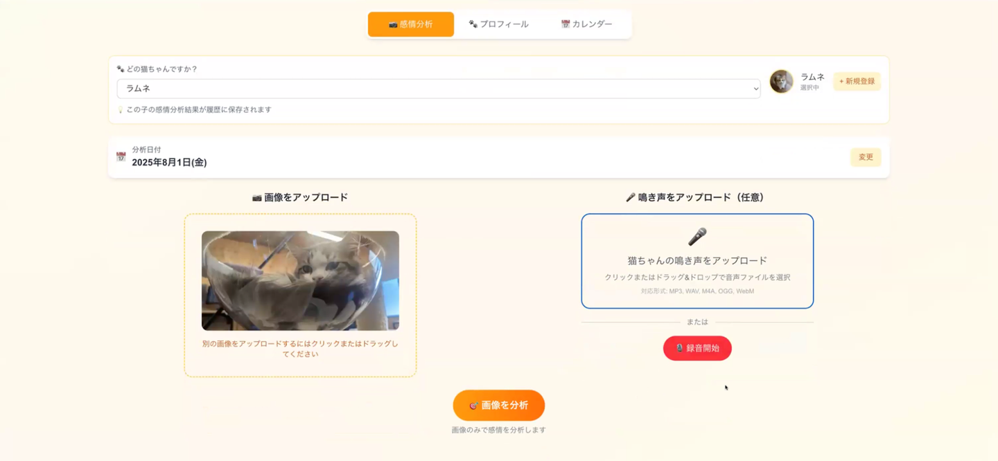 猫の気持ちを翻訳する「ネコ語翻訳アプリ」を開発。猫の画像や鳴き声(音声)を分析し、感情を擬人化されたセリフで表示。過去の分析履歴も確認でき、AIが独自の「ネコ語」概念を生み出し感情を分析する奥深さを感じさせられました。
