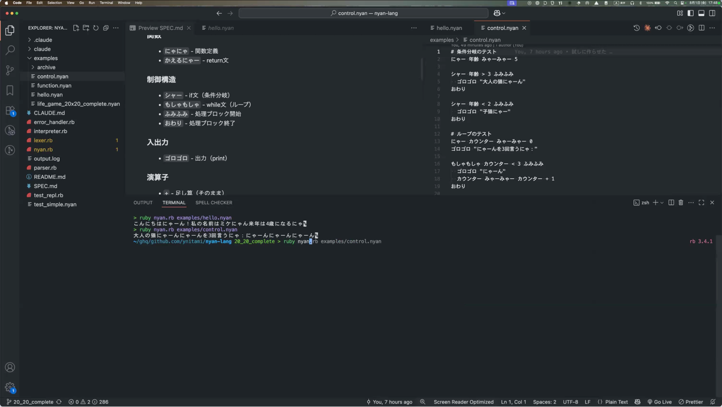 猫の鳴き声でプログラミングができる新言語「Nyan Lang(ニャンラング)」を発表。「ニャー」が変数宣言、「シャア」が条件分岐など、全ての命令が猫の鳴き声や仕草を模しています。デモではライフゲームが猫語で動く様子も披露されました。
