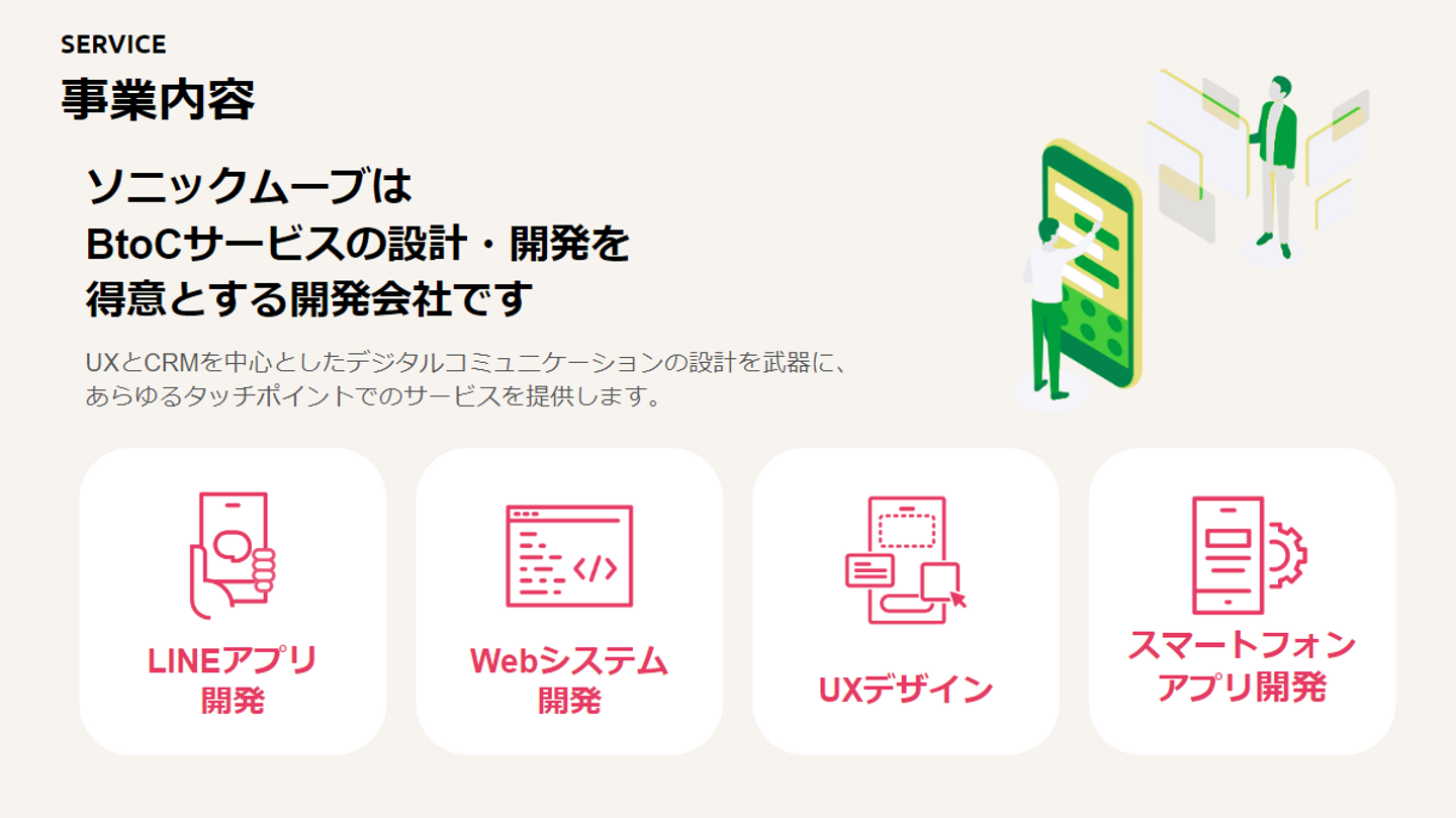 ソニックムーブはBtoCサービスの設計・開発を得意とするWebシステム・アプリ開発の会社です。