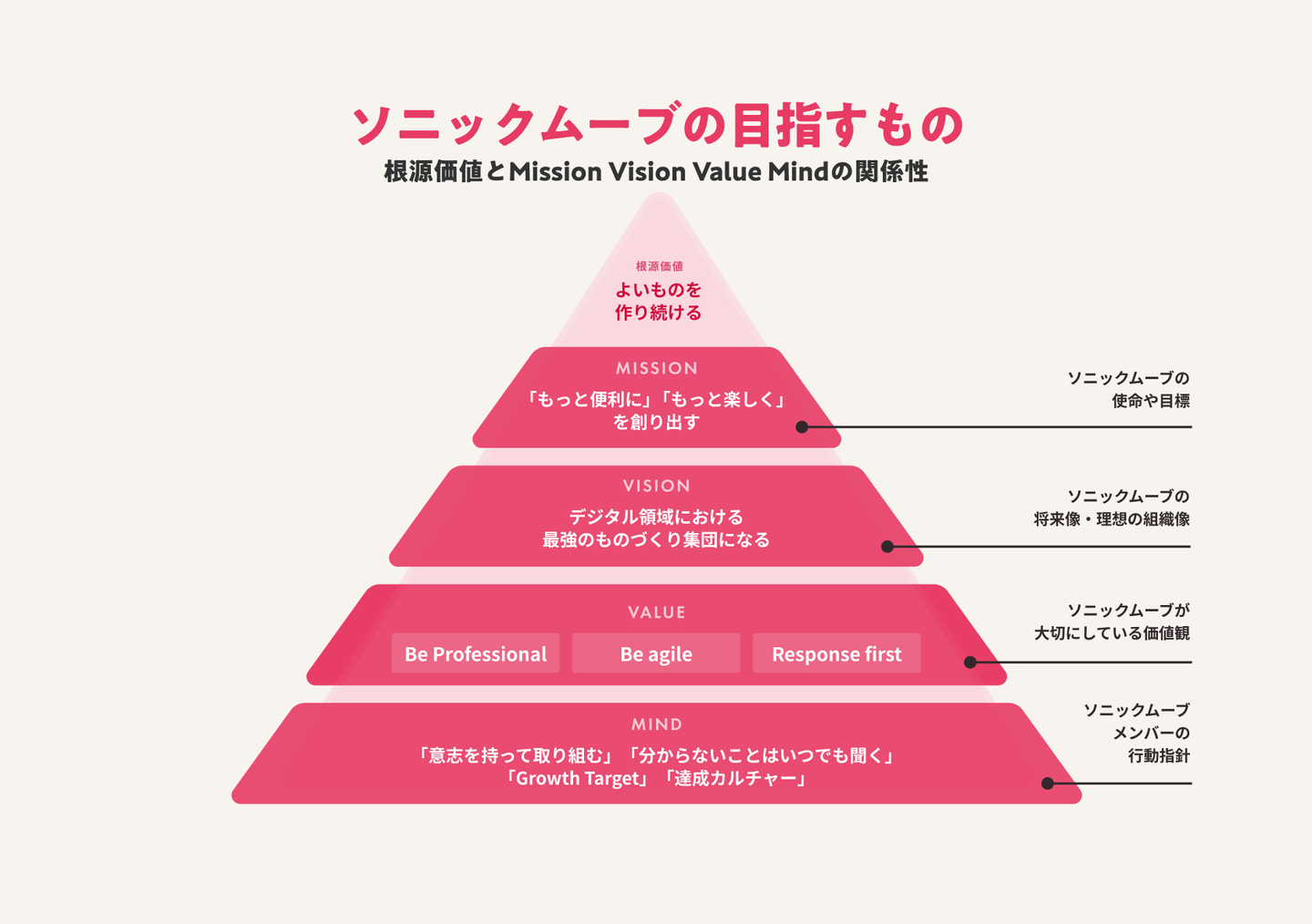 弊社のMVV(ミッション・ビジョン・バリュー)+根源価値には代表大塚の価値観や想いが込められています。弊社の「ものづくりをしていくうえで大切にしている考え方」を言語化しているものになります。