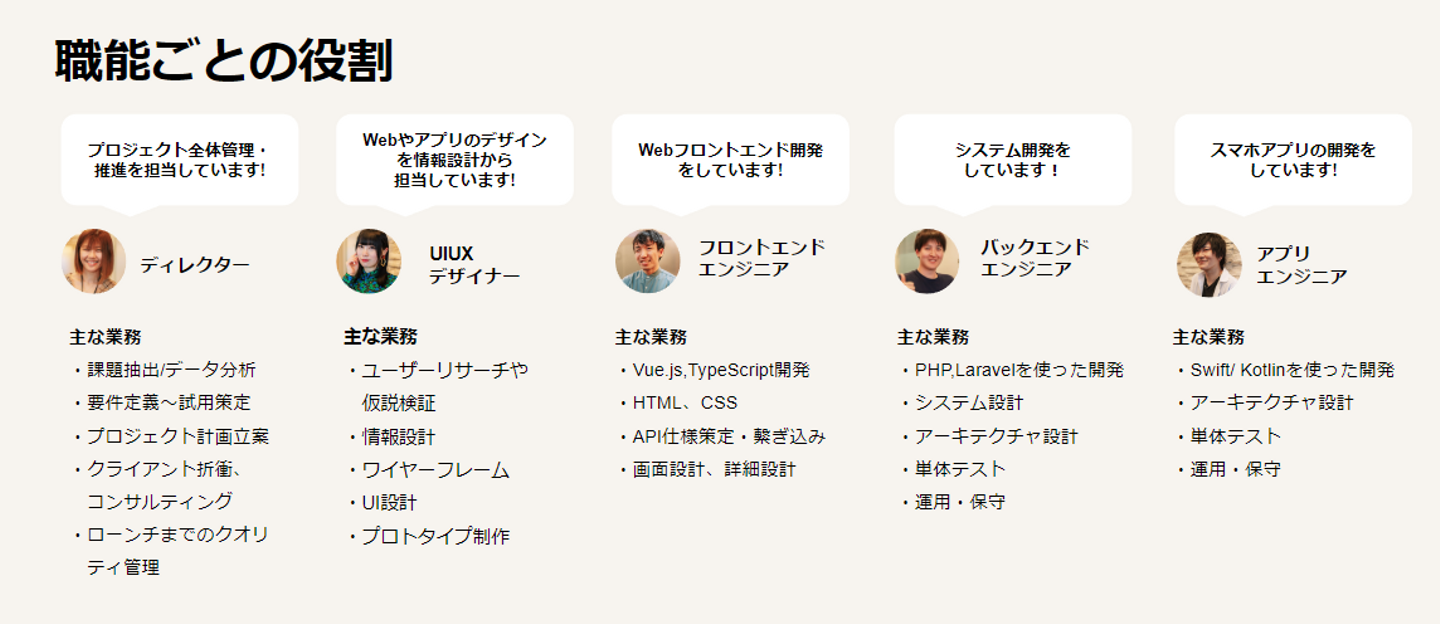 弊社にはプロジェクトマネージャー・Webディレクター・UIUXデザイナー・エンジニア等、ものづくりをしていくうえで必要なメンバーが揃っており、自社内でワンストップな開発ができる環境があります。