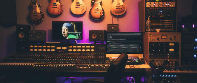 音楽機材があり、音楽スタジオのような雰囲気です。