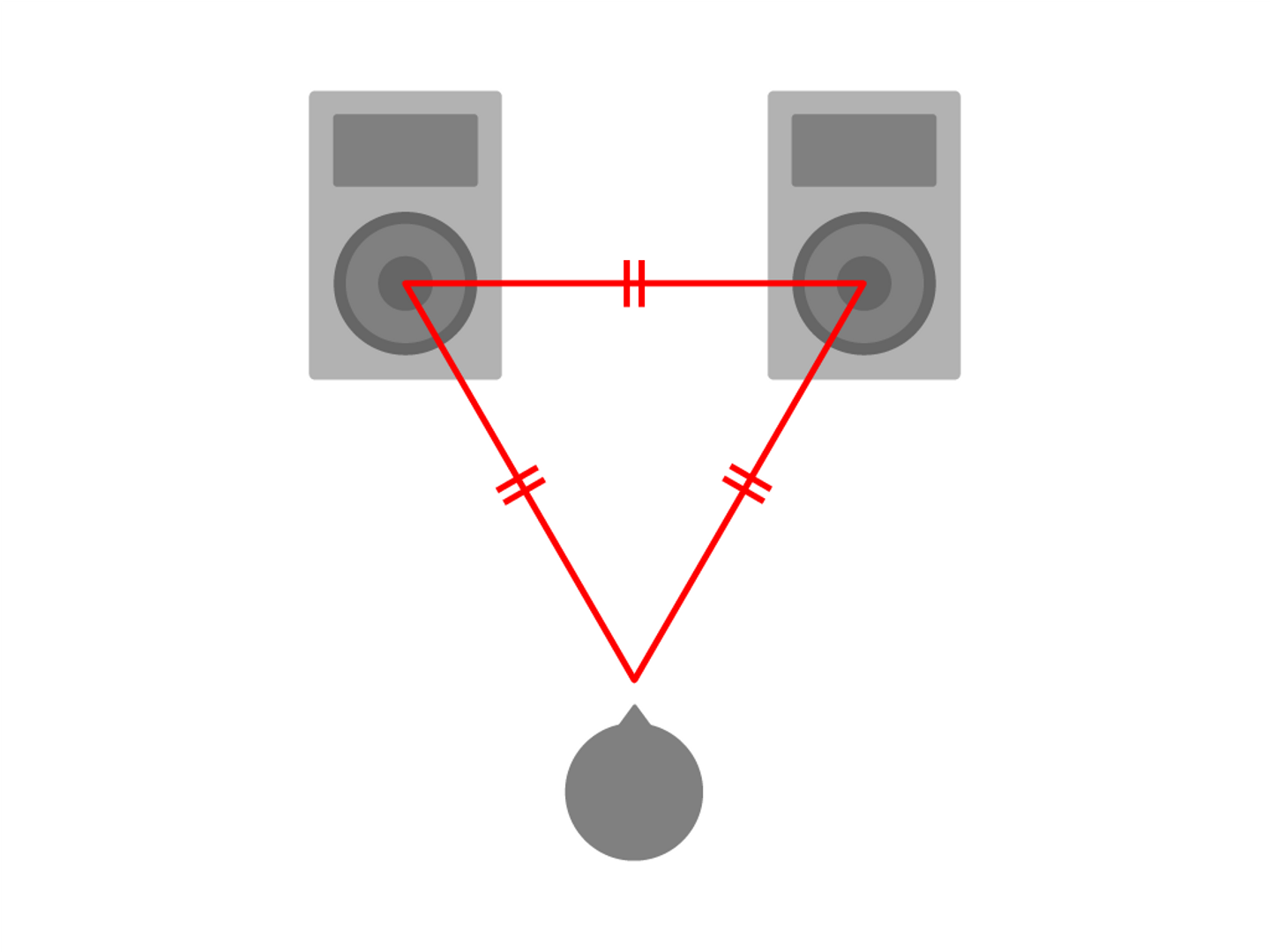 適切なリスニングポイントは、左右のスピーカーを結んだ線を底辺とした正三角形、もしくは二等辺三角形の頂点です。この場所をスイートスポットといいます。