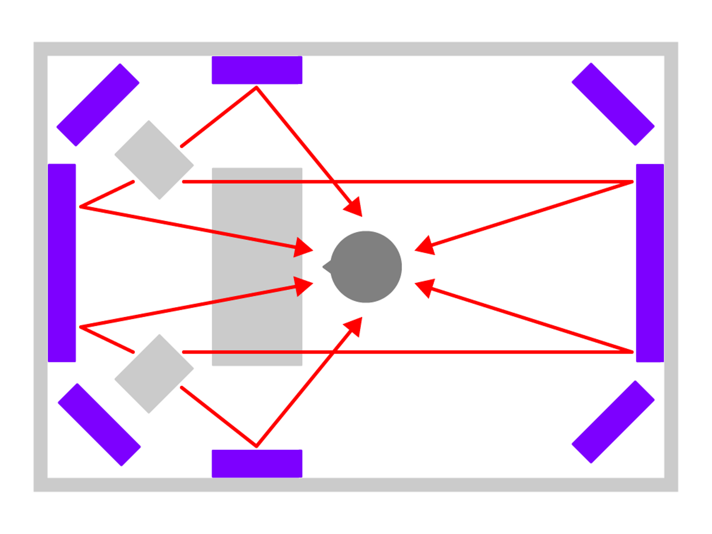 以下はイメージ図です。スピーカーの背面、正面、左右に加えて、部屋の四隅に置くと良いです。