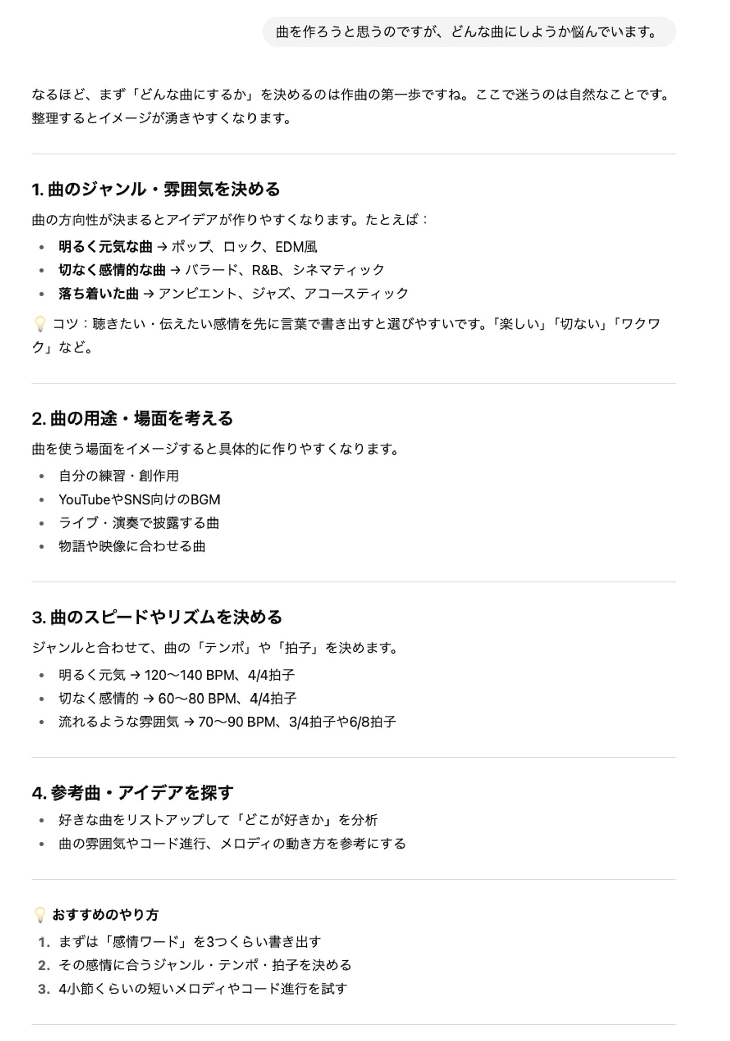 たとえば、「メロディと歌詞はあるけど、この先楽曲を配信するには何をすれば良い?」などを質問してみると、その後の道筋を教えてくれるでしょう。
