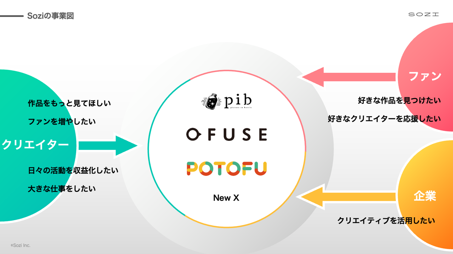 先ほどあったように、Soziはクリエイターの活動を後押しする事業を展開していますが、それは最終的に、クリエイターにお金が回る仕組みを作ることです。創作手法を学んだり、ファンを増やしたり、活動に集中できる環境を整えてゆくこともSoziの大きな取り組みの一つですが、その先に、ファンの方からの応援や企業からのお仕事など、しっかりとお金が入る状態があるべきと考えています。