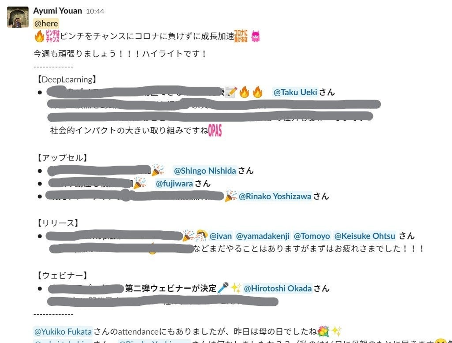 お互いの状況を知り仲間が頑張っているのを感じてもらうため、前日にあった良いことをピックアップしハイライトとして私が毎朝広報しました。