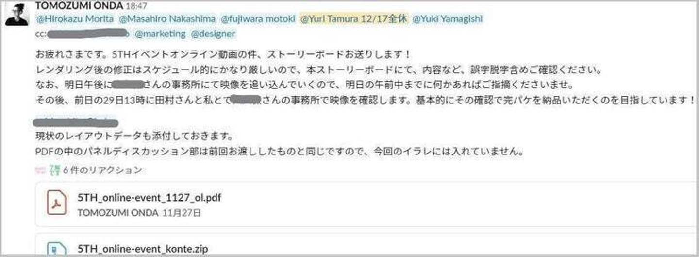 小太刀:撮影後、編集動画が出来上がる数日前に、恩田さんがSlackでコンテンツと時間詳細を箇条書きにして何か社内に周知してましたよね。