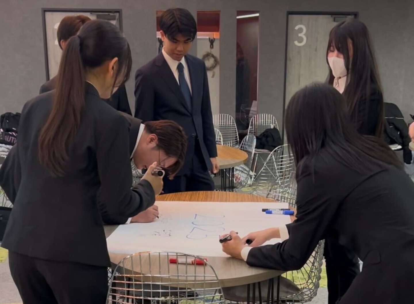 責任者の話を聞いて気持ちが高まったところで、将来の夢や目標を模造紙に書いてもらいました!