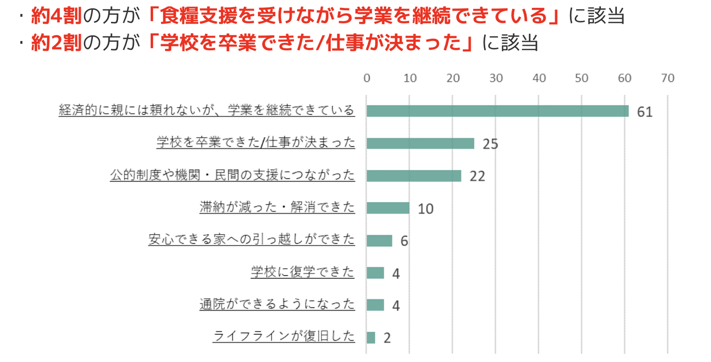 今井:ありがたいことに本当にいっぱいあって。例えばユキサキチャットだと、6ヶ月以上食糧支援でサポートした方の4割ぐらいがいま学業継続していて、2割が支援制度につながって、2割が就職したといった割合です。それに大学卒業して就職した子が、うちの寄付のサポーターになってくださったりとか。