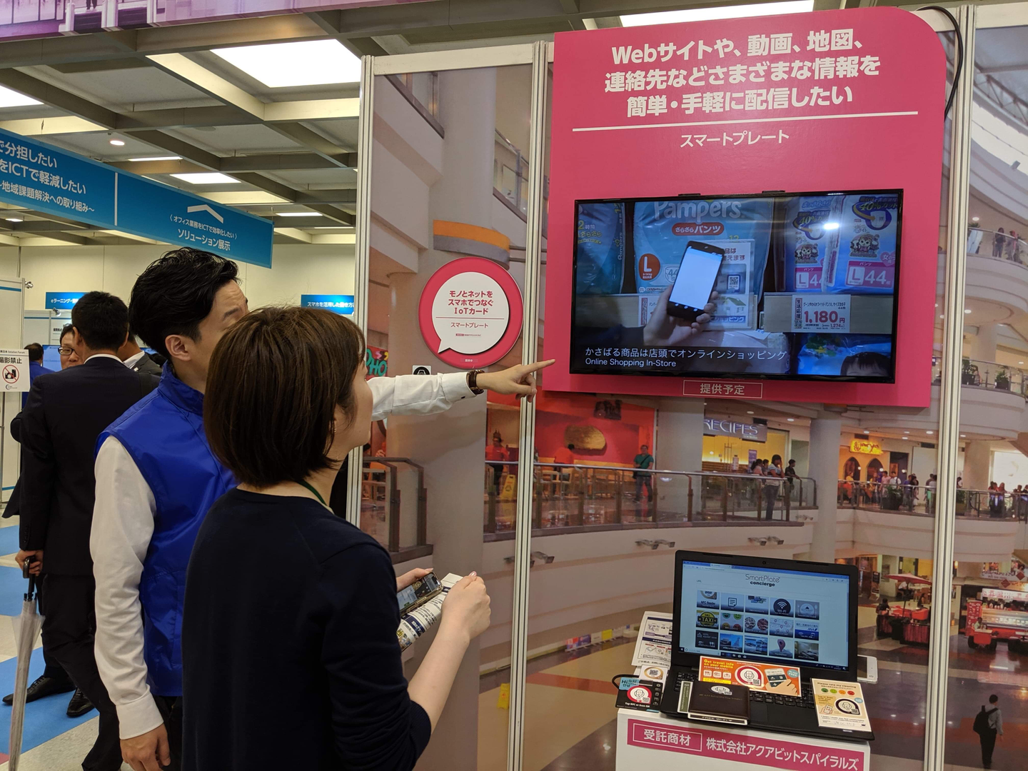 100近いブースがご用意されましたが、各ブースにスマートプレートを設置し、各ソリューションの詳細情報をデジタルでもご確認いただき、情報をお持ち帰りいただけるようにしました。非常にシンプルな使い方ですが、その場所にあったデジタル情報の配信、という観点ではスマートプレートが得意とする使い方です。