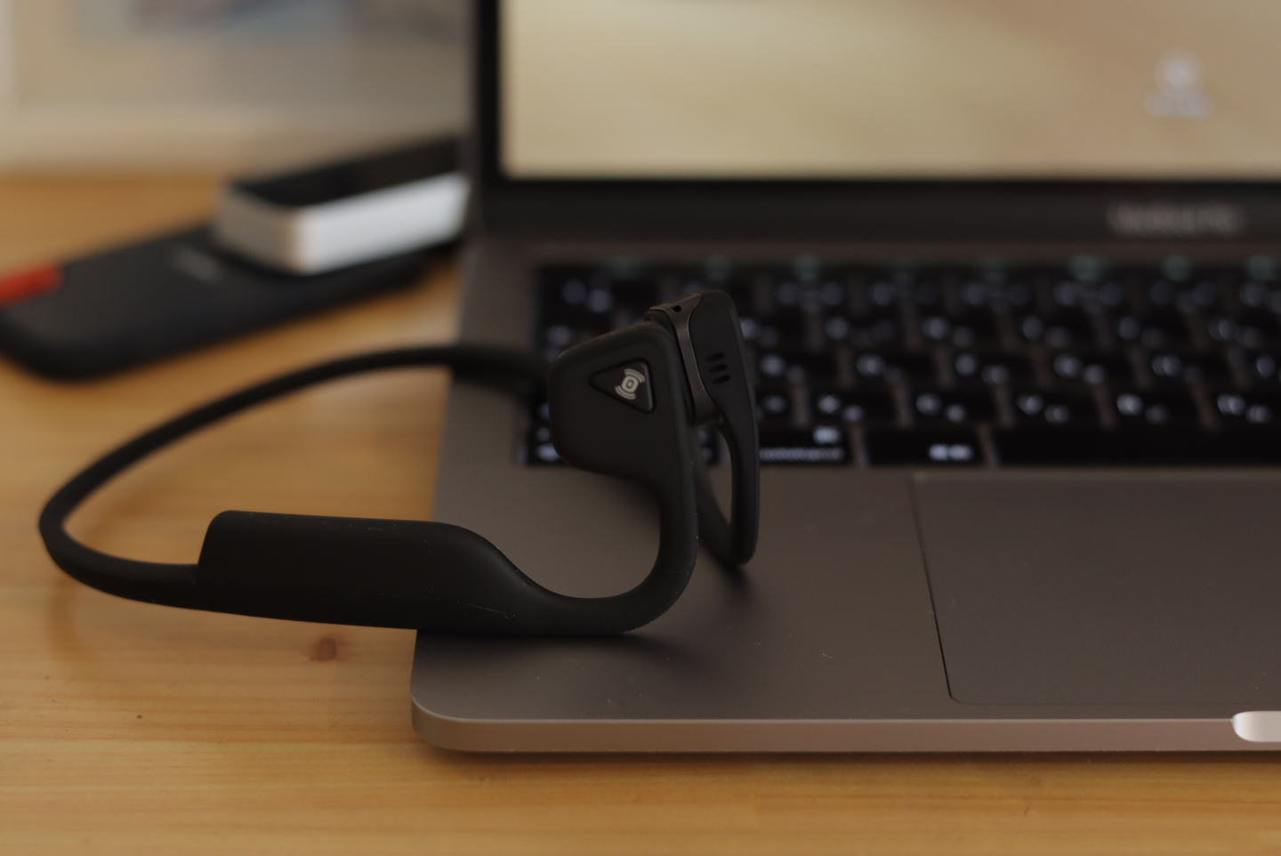 骨伝導ワイヤレスヘッドホンで耳を塞がないタイプのイヤホン「AfterShokz」です。耳が痛くなりづらく、外の音も聞こえます。Zoomの会議時間が長い日はヘッドホンで疲れてしまうので、軽減のためにこちらを使っています。