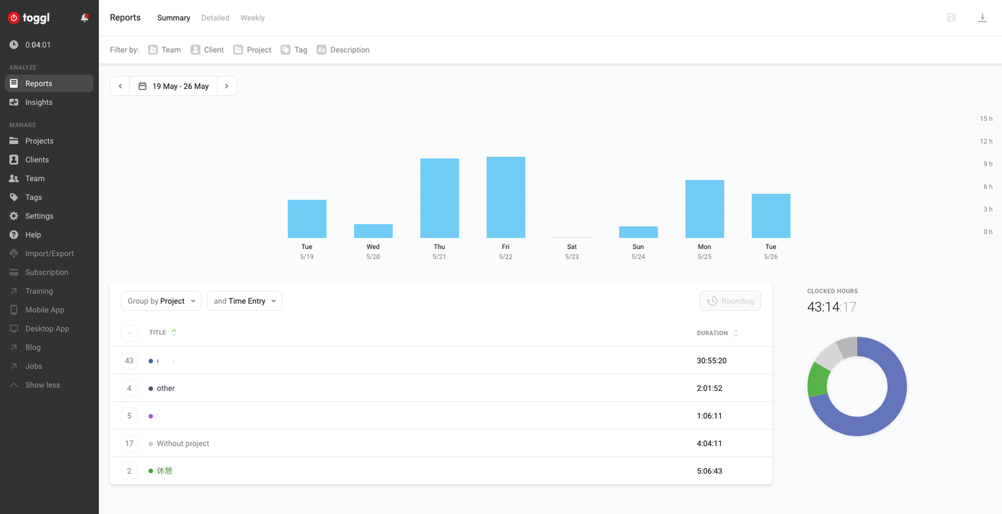 リモートワーク初期は自分の時間管理とかがうまくできなくて困ってたので、自分が何に時間がかかっているのか記録するために「Toggl」を使ってみたりしてました。