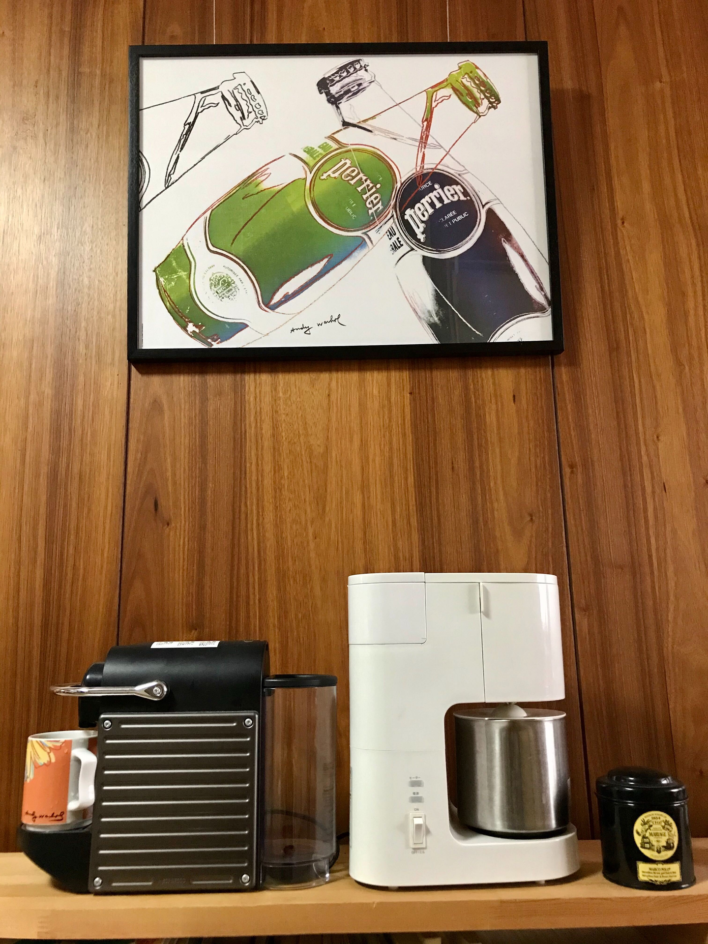 上に掛かってるのは、アンディ・ウォーホルの昔のPerrierのポスターです。思い入れがあったので、探してバーゼルのショップから取り寄せました。