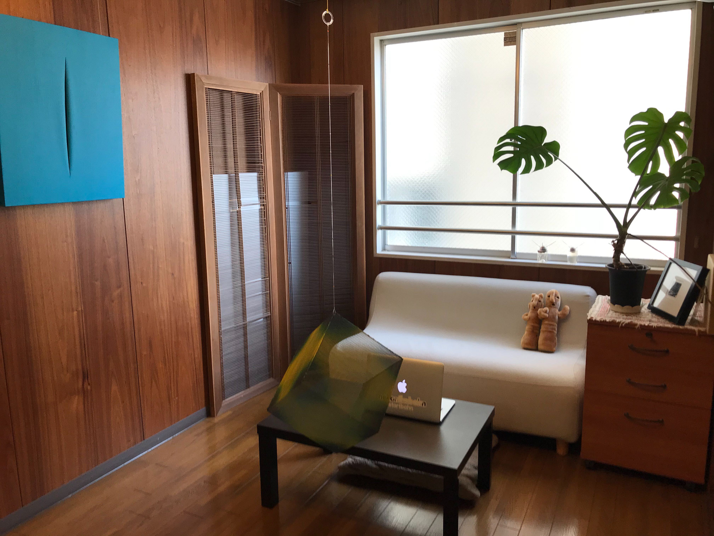 真ん中にぶら下がってるのはガラス作家の和田朋子さんの編戸作品。コロナ渦でおうちで楽しめるものをと数ヶ月前に軽やかさが気に入って購入しました。
