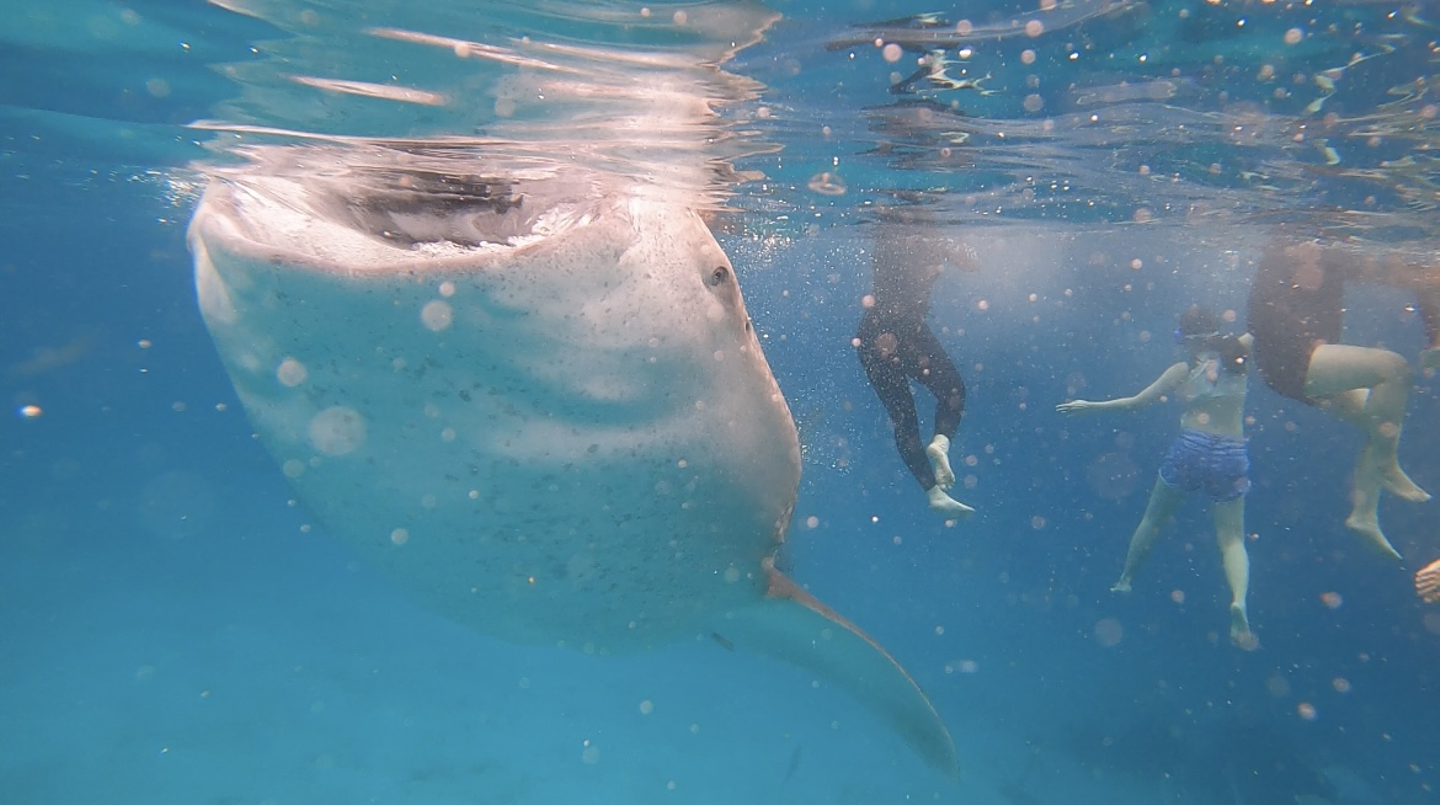 何頭ものジンベイザメと、こちらが避けないと触ってしまうくらいの距離で泳ぐことができます!ちょっと怖いかもしれませんが、ジンベイザメはとっても優しい性格でプランクトンをパクパクしているところがとても可愛いんです。一応野生なのですが、地元の人に日々餌付けされているため、すごくフレンドリーでした。(笑)