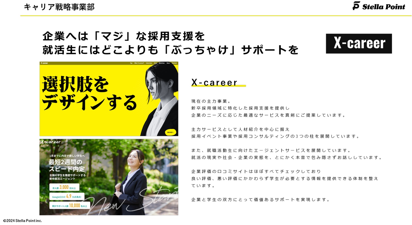 当社Stella Pointは、人材紹介・研修・採用コンサルティング・採用イベントなどの新卒採用支援事業を展開しています。『半径5m以内の人を幸せにする』を理念に、一人ひとりが「ココロ弾む」選択肢を広げる社会を目指しています。新卒学生向けのエージェントサービス「X-career」をはじめ、学生主体の研修プログラムである「X-base」を提供し、企業や団体の経営戦略・人材戦略の実現に貢献しています。