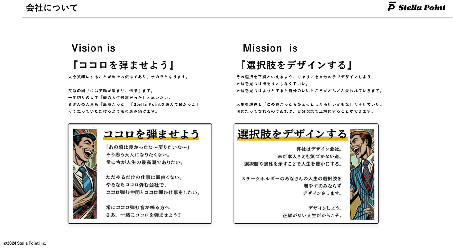 当社Stella Pointは、人材紹介・研修・採用コンサルティング・採用イベントなどの新卒採用支援事業を展開しています。『半径5m以内の人を幸せにする』を理念に、一人ひとりが「ココロ弾む」選択肢を広げる社会を目指しています。新卒学生向けのエージェントサービス「X-career」をはじめ、学生主体の研修プログラムである「X-base」を提供し、企業や団体の経営戦略・人材戦略の実現に貢献しています。