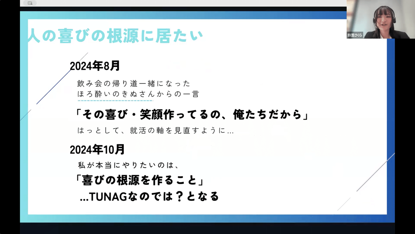 TUNAGでのインターン活動を通じて感じたこと、そして“新卒としてスタメンでどう成長していきたいか”を、約140名を前に堂々と語りました。