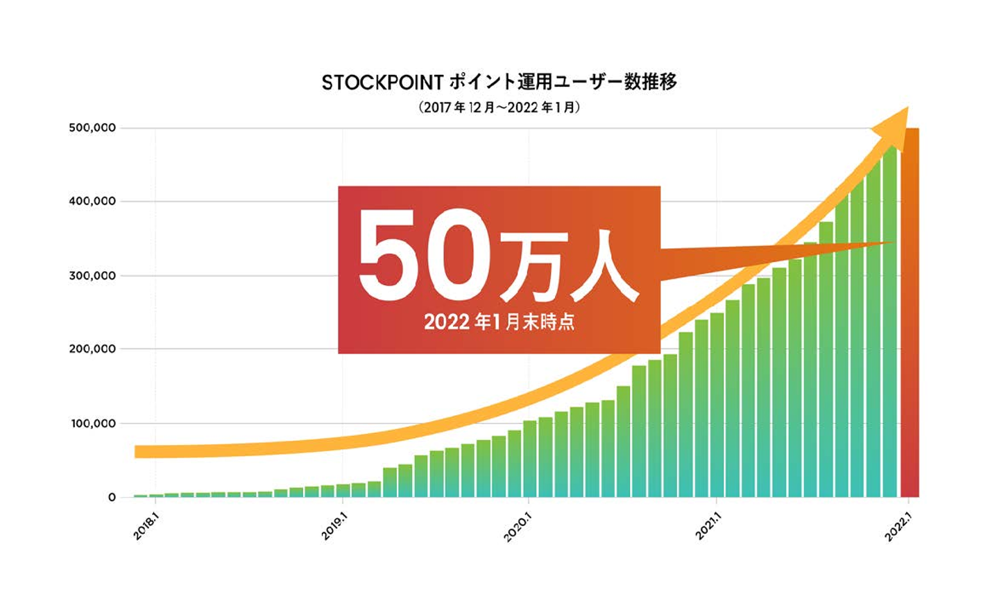 STOCKPOINTでは、「StockPoint」「StockPoint for CONNECT」「STOCKPOINT for MUFG」という3つのアプリを提供しております。その3つのアプリに登録している会員様の合計が、2022年1月に50万人を突破しました。現在も順調に会員数は増加しております。下記は一番最初にリリースしたアプリ「StockPoint」のサービススタートから、現在に至るまでの会員数の推移を表したグラフです。