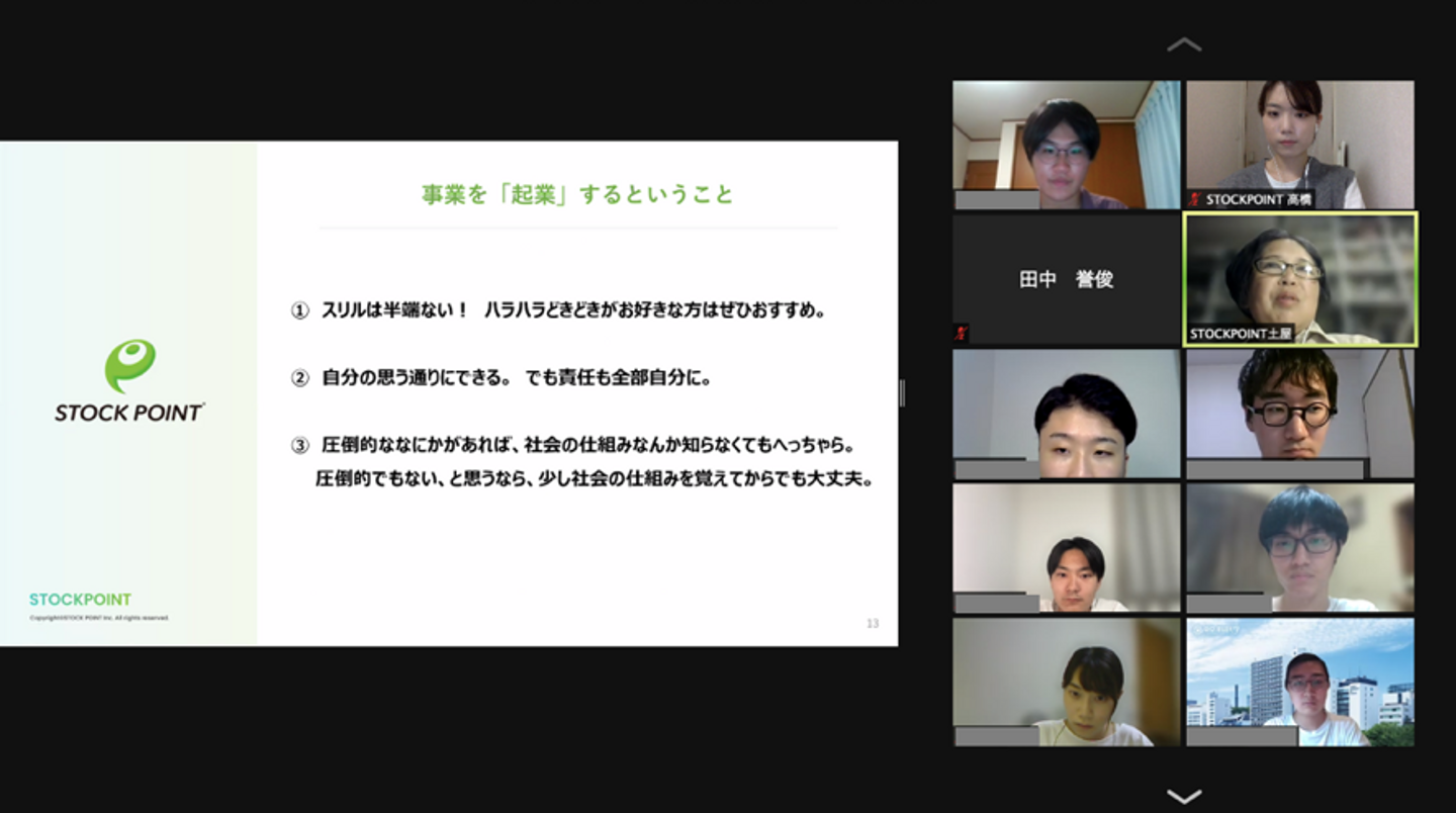 また、Albusの皆様の中には、将来的に事業の立ち上げを考えている学生も少なくないため、弊社代表の土屋社長より、STOCKPOINTの創業ストーリーをご紹介するなど、盛りだくさんな内容となりました。