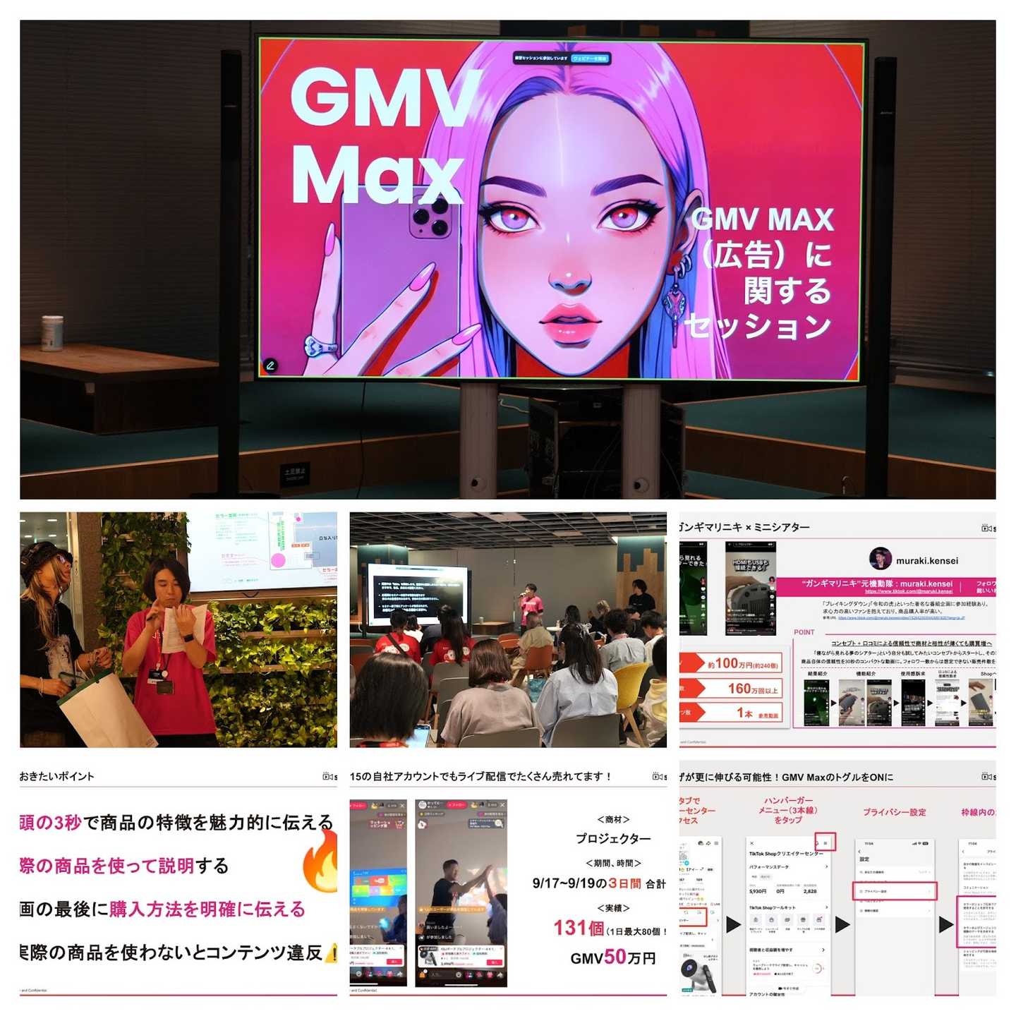 それぞれのエリアで、セラーとクリエイターがコミュニケーションをとりつつ写真や動画を撮影が行われ、セミナーエリアでは『売れる動画の秘訣』や『TIkTok Shopで売上を向上させる広告、GMV Max』などについて講演がなされました。