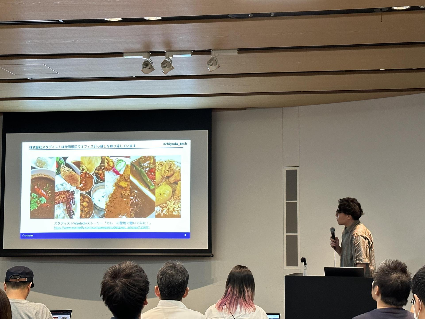 冒頭でメシテロスライドがあり会場がざわざわ。スタディストのオフィス周りにはカレー屋が多いのです。
