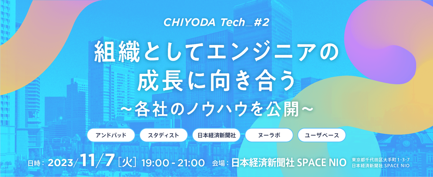 第二弾はアンドパッドさん、日本経済新聞社さん、ヌーラボさん、ユーザベースさん、スタディストの5社で「組織としてエンジニアの成長に向き合う」をテーマに各社の取り組みをシェアしました。(この並びだけでも感じていただけると思うのですが、千代田区って本当にいろんな会社さんがあるんですよ…!)