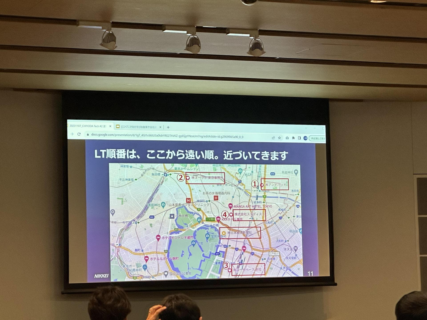 今日の登壇について案内があったのですが、実は登壇の順番は、会場からの距離! 徐々に会場に近づく仕組みです。笑 アンドパッドさん→ヌーラボさん→ユーザベースさん→スタディスト→日本経済新聞社さんの順番でLTがはじまりました◎