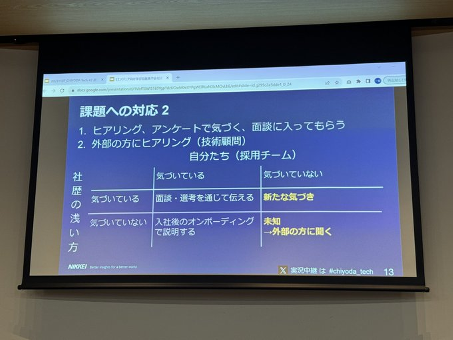 「成長」は企業が提供できる価値の1つであることや(EVP:Employee Value Propositionというらしい)、日経さんのエンジニア組織が抱える課題、そこに対しての具体的な施策をお話いただきました。
